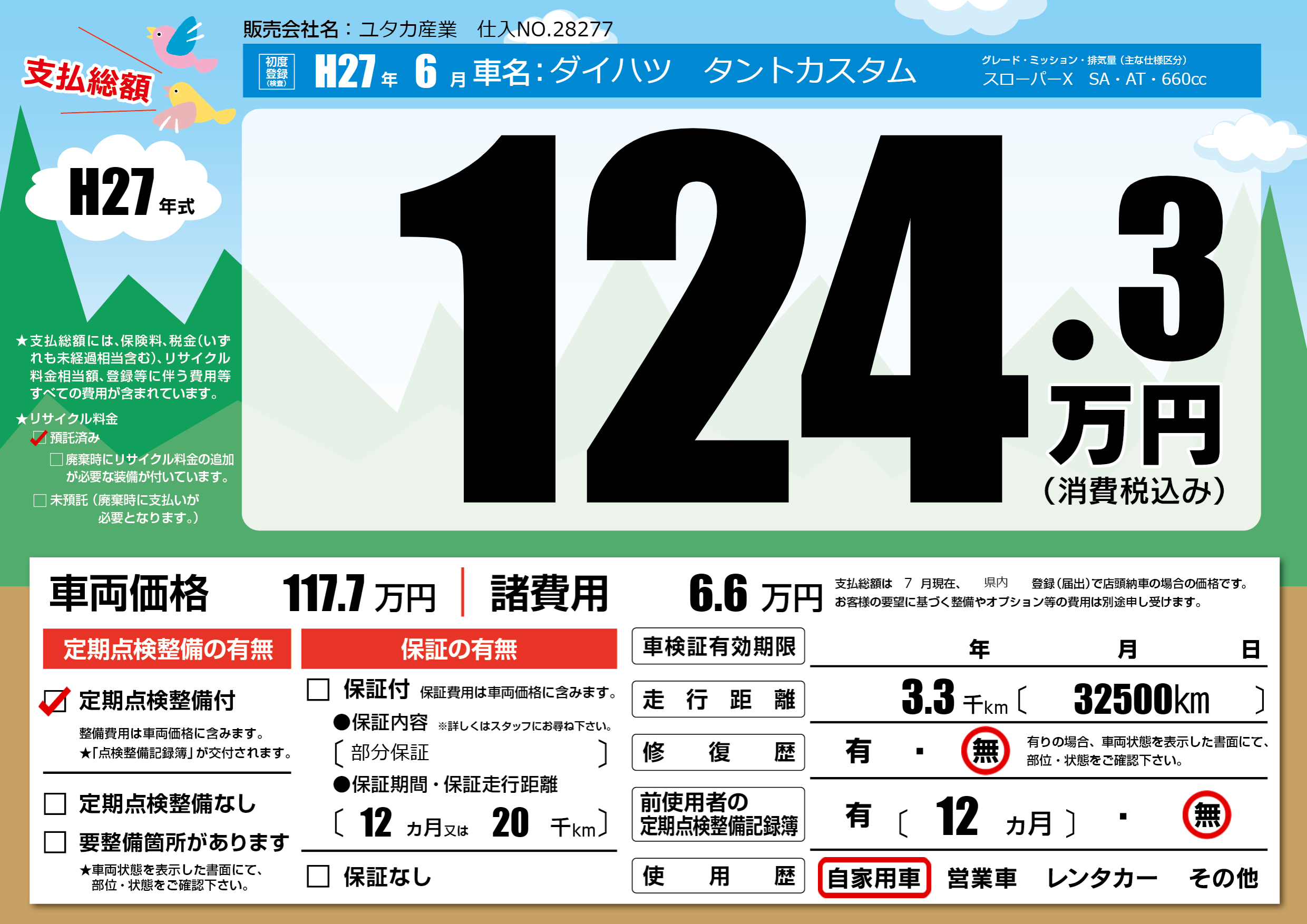 | 走行キロ | 0.3万km | 初年度登録 | H27年6月 |