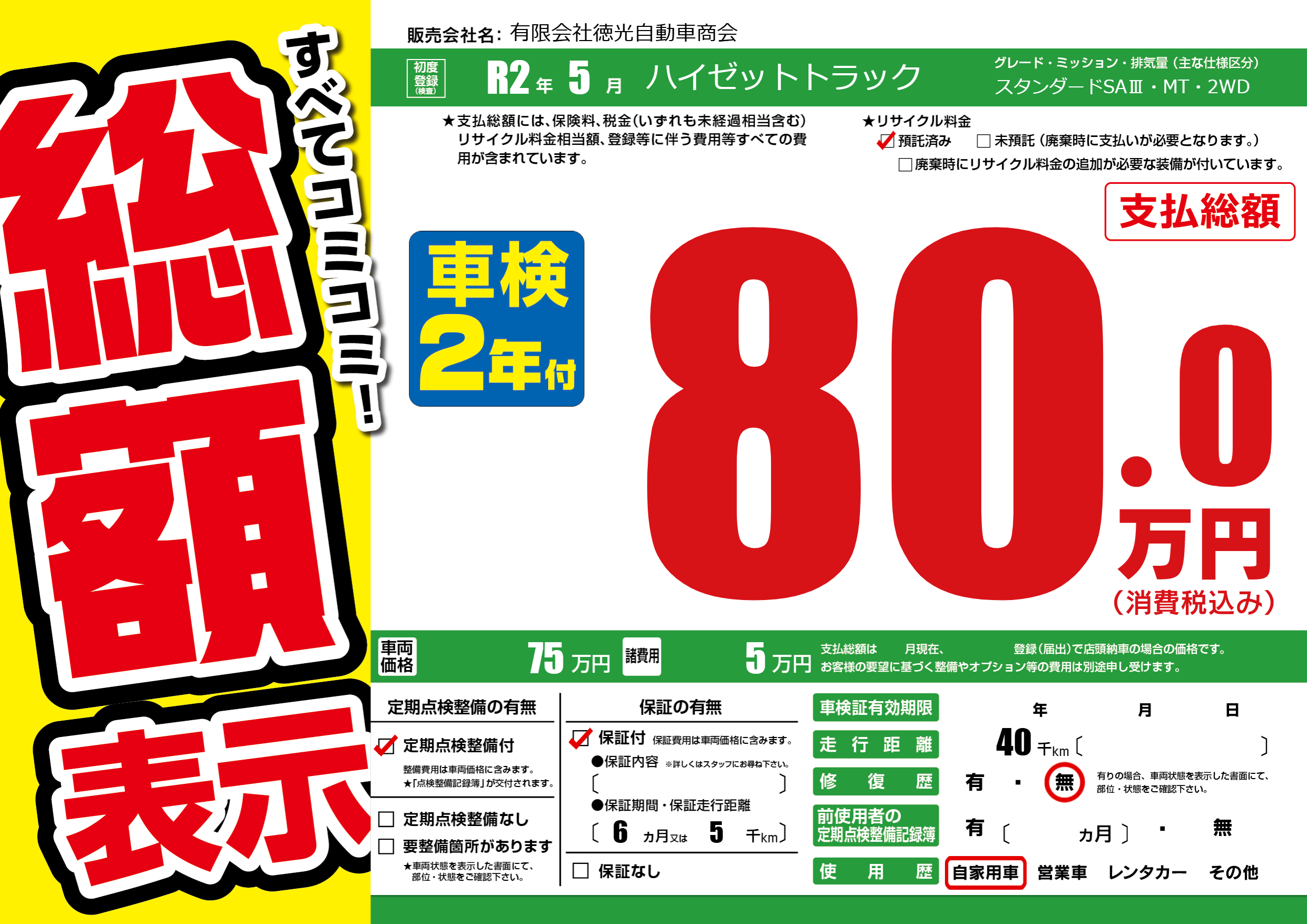 | 車名 | ハイゼットトラック | グレード ミッション 排気量 |