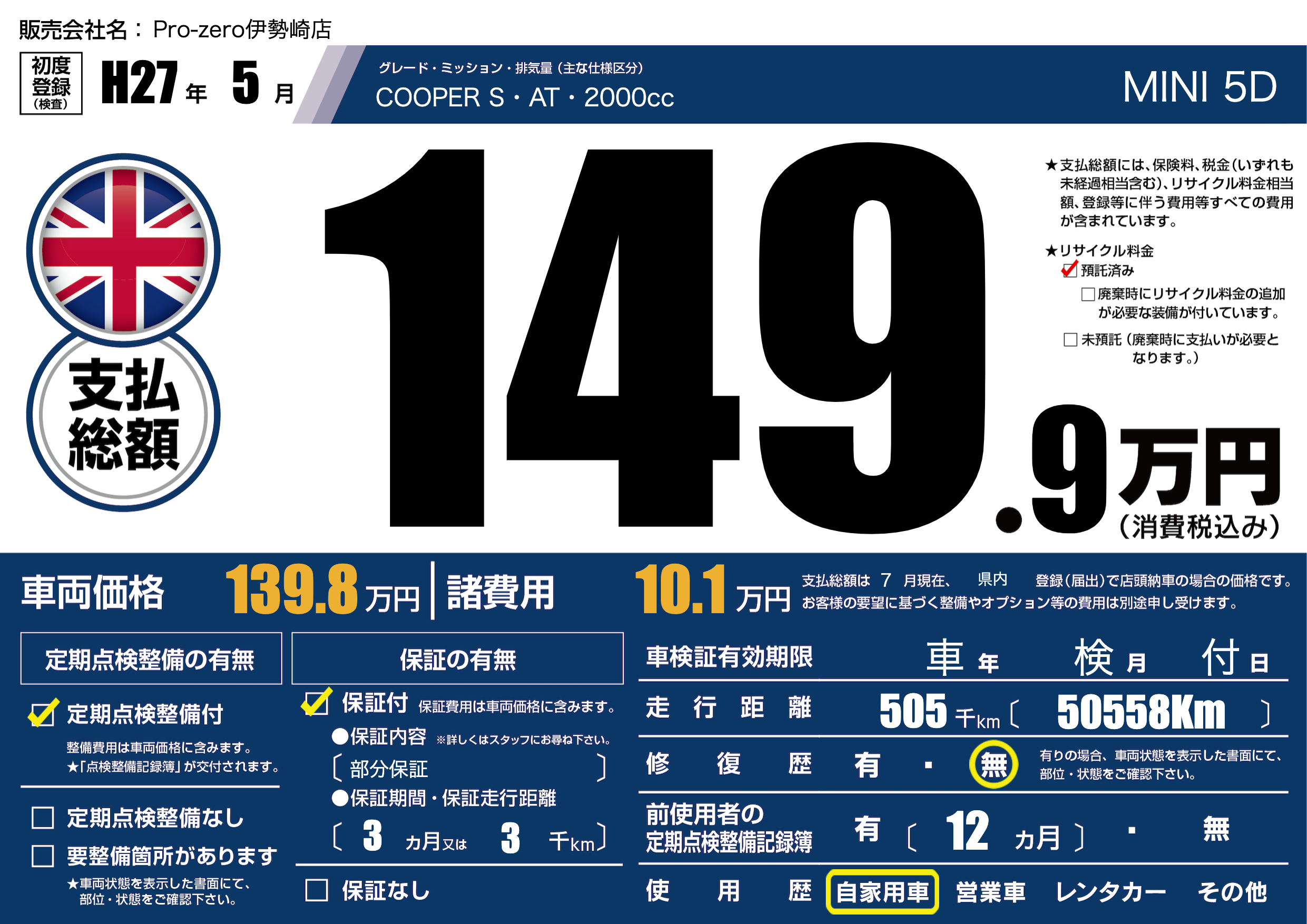 | 走行キロ | 50.5万km | 初年度登録 | H27年5月 |