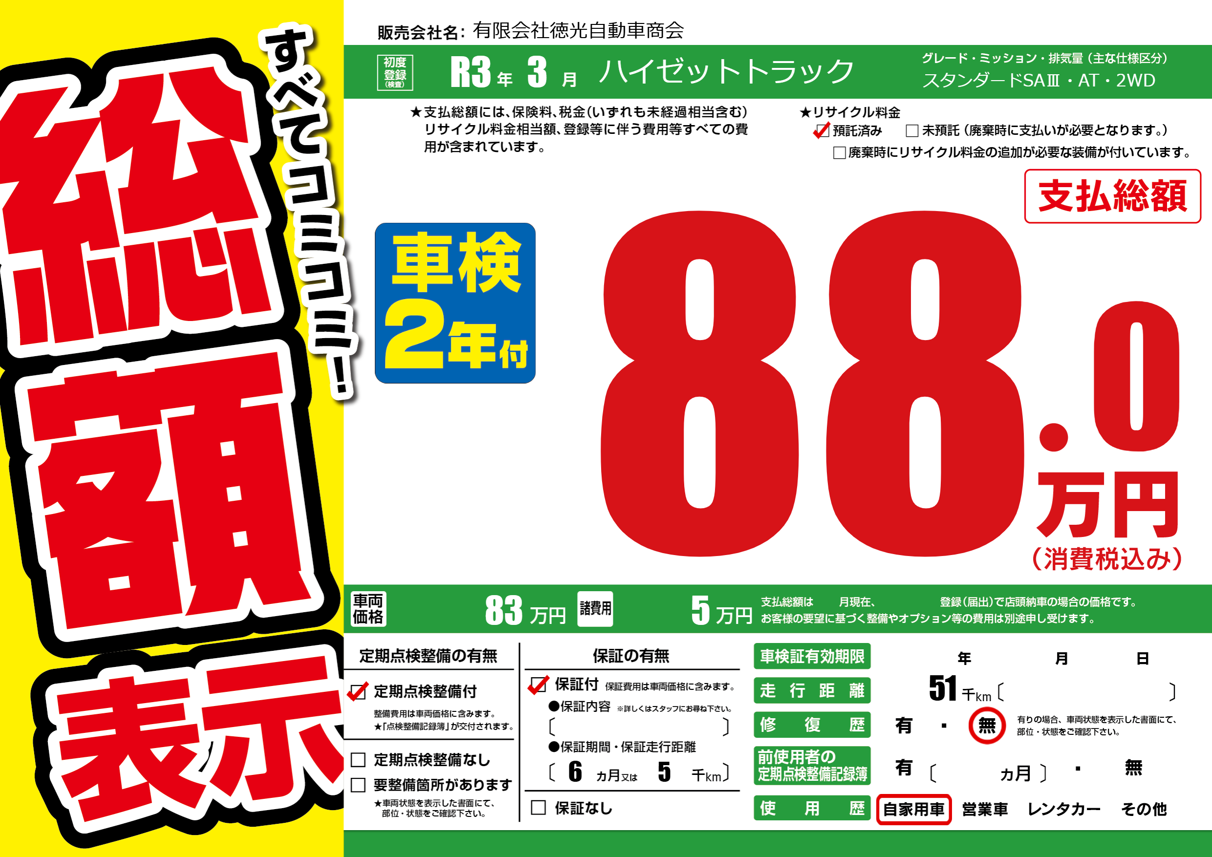 | 車名 | ハイゼットトラック | グレード ミッション 排気量 |