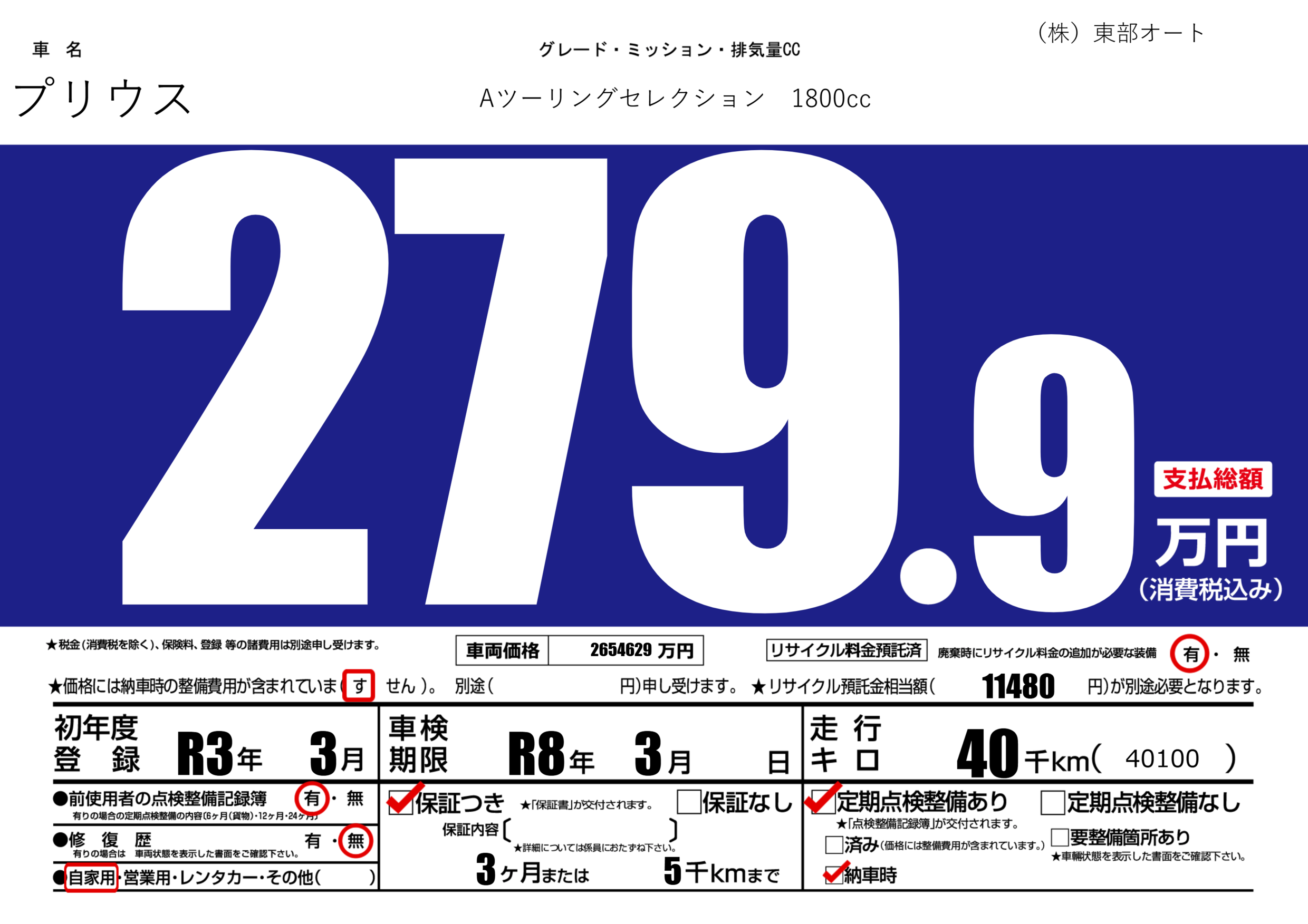 | 車名 | プリウス | グレード ミッション 排気量 |