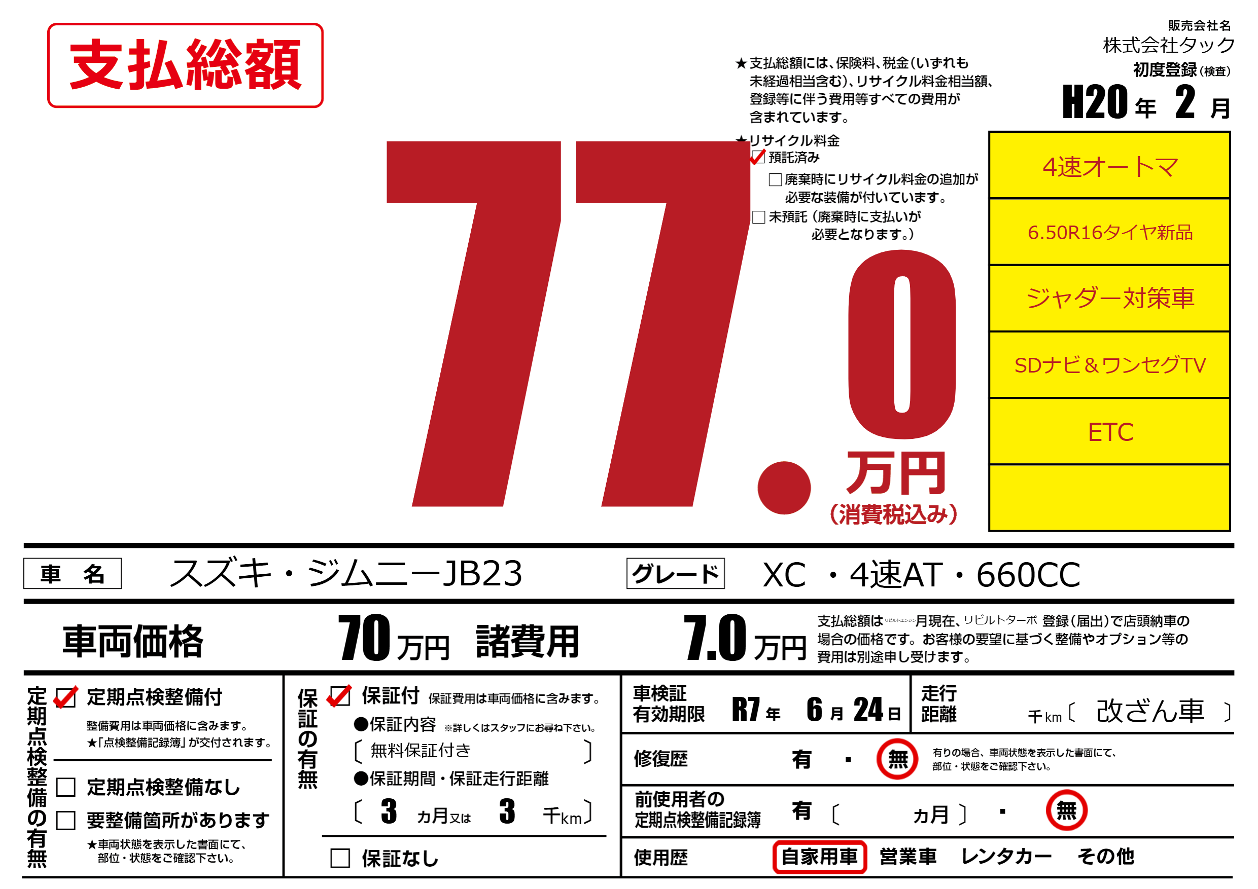 | 車名 | スズキ・ジムニーJB23 | グレード ミッション 排気量 |