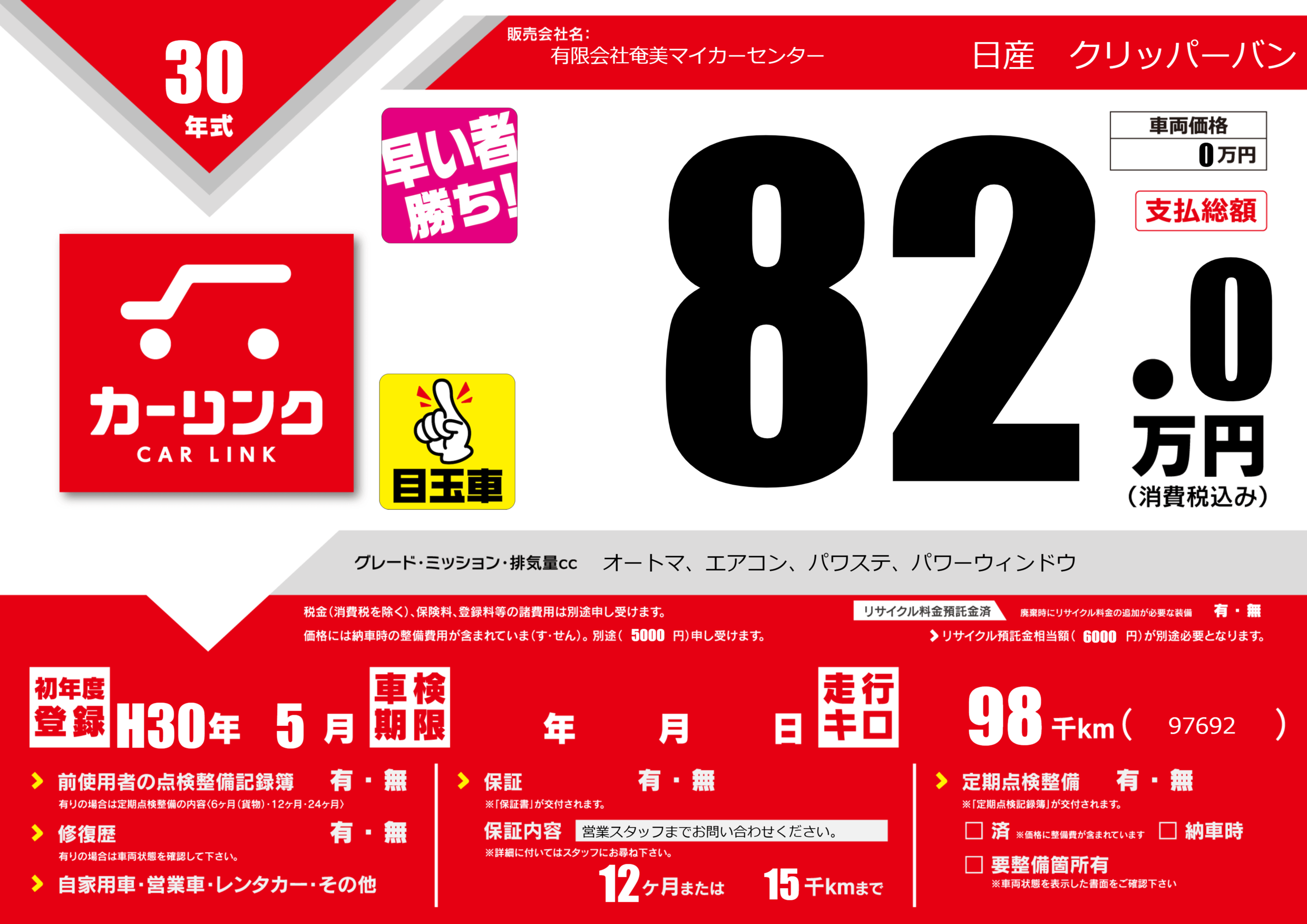 | 走行キロ | 9.8万km | 初年度登録 | H30年5月 |