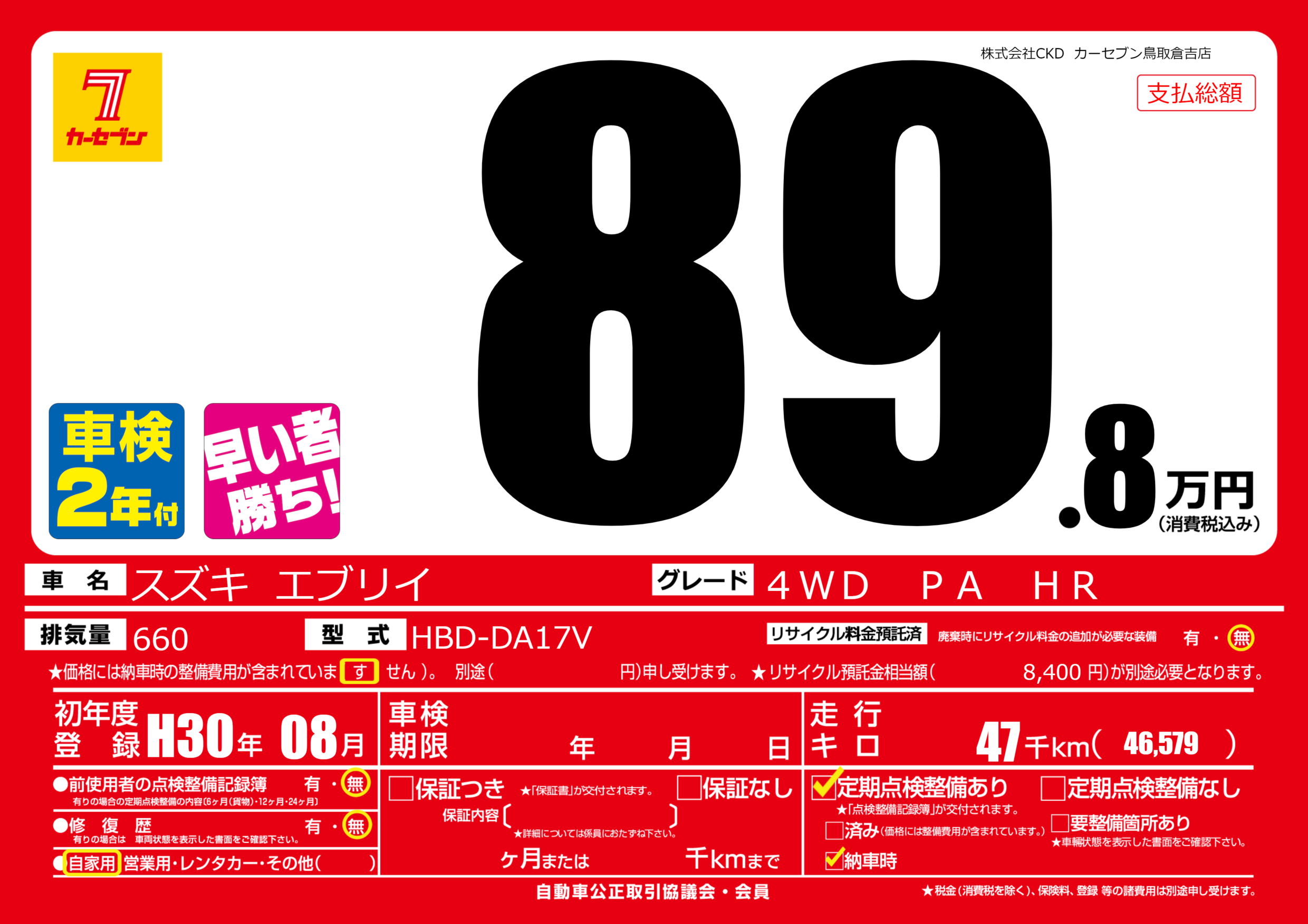 | 定期点検整備 | 定期点検整備あり 納車時あり | ||