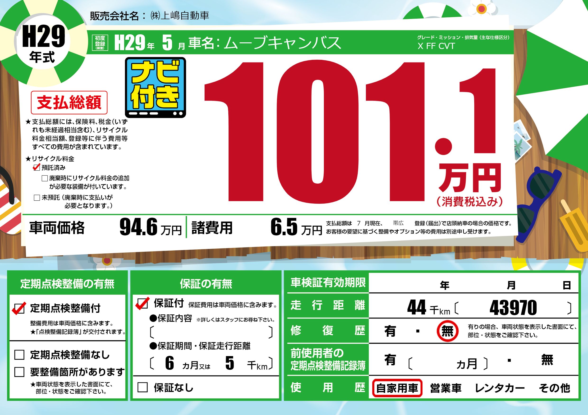 | 車名 | ムーブキャンバス | グレード ミッション 排気量 |
