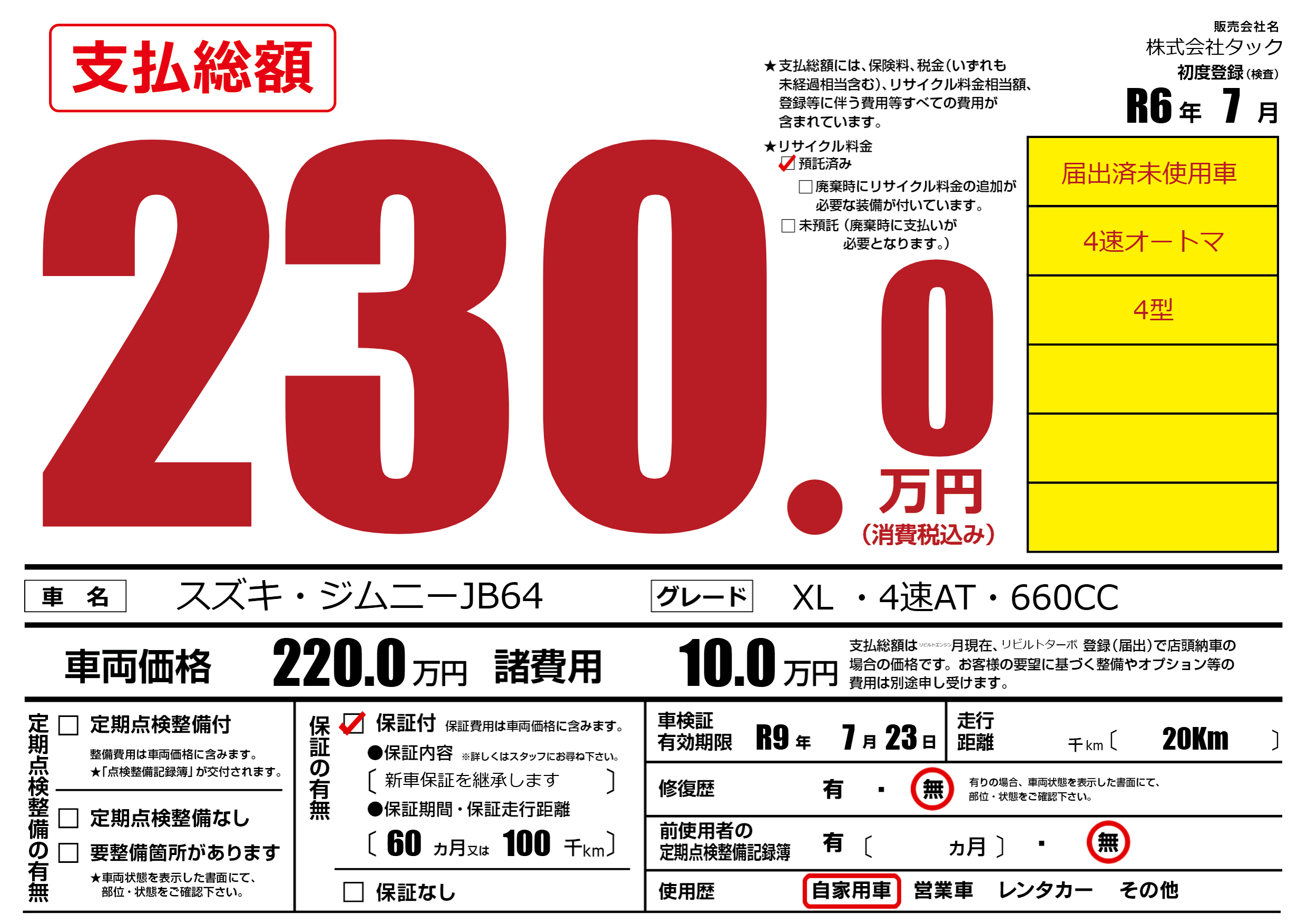 | 走行キロ | - | 初年度登録 | R6年7月 |