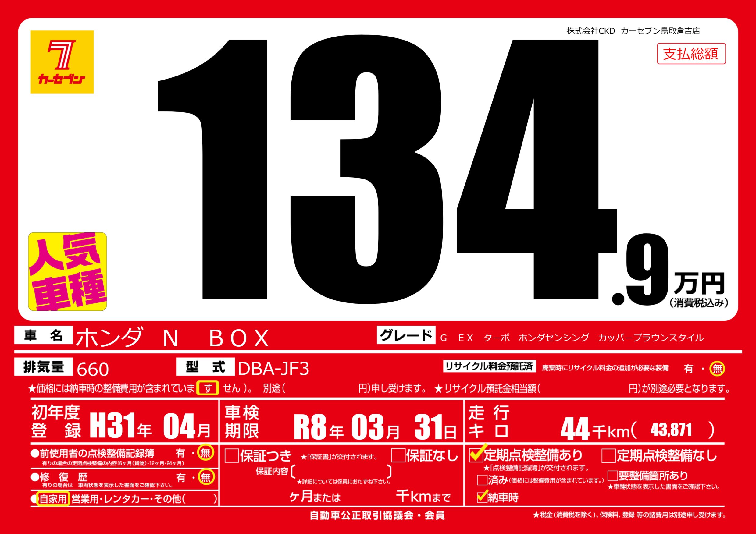 | 車名 | ホンダ N BOX | グレード ミッション 排気量 |