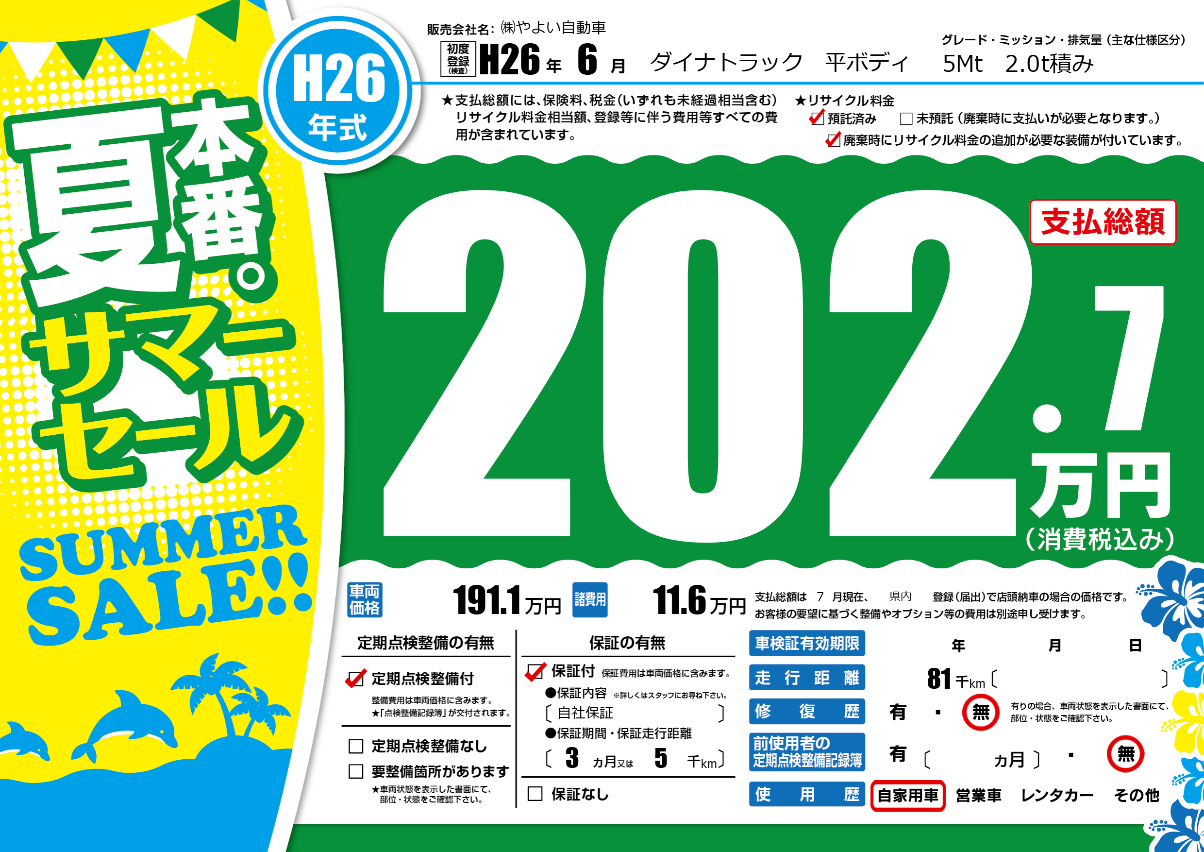 | 車名 | ダイナトラック 平ボディ | グレード ミッション 排気量 |