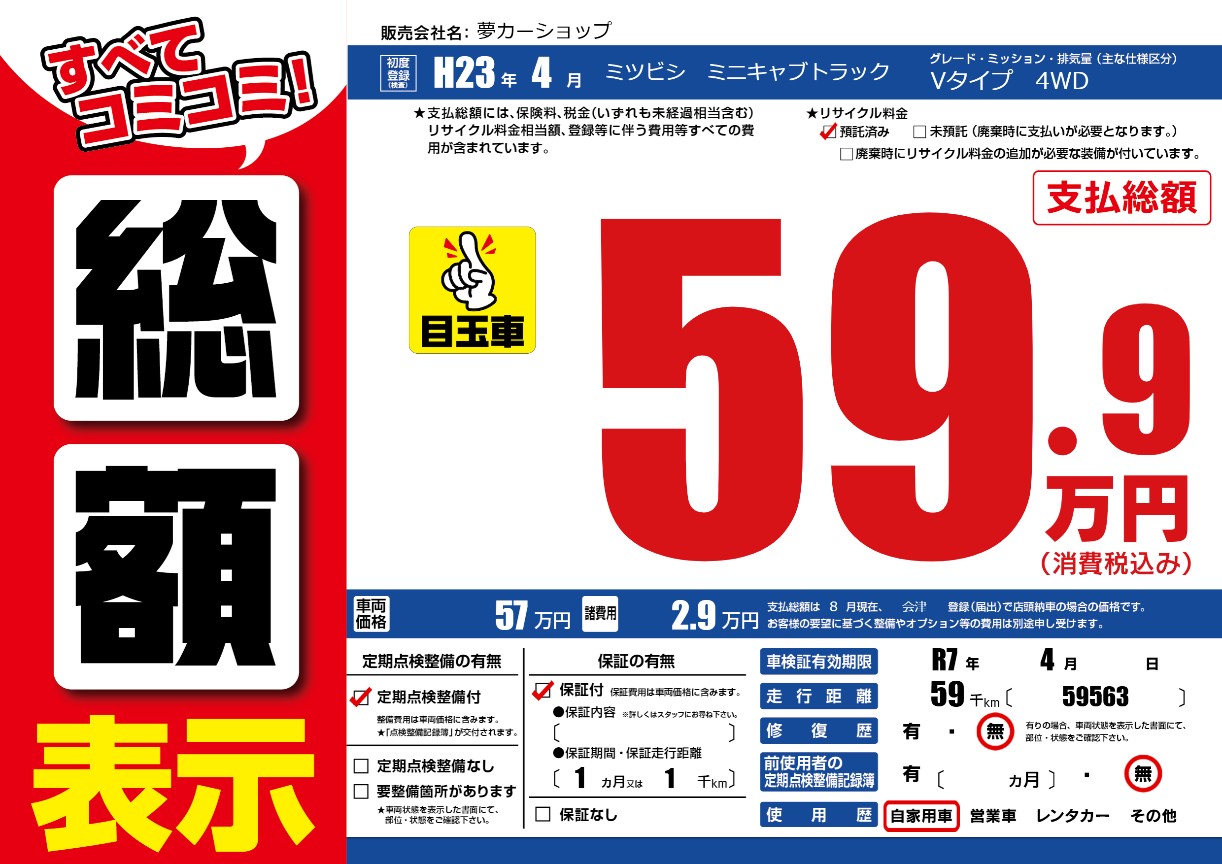 | 車名 | ミツビシ ミニキャブトラック | グレード ミッション 排気量 |