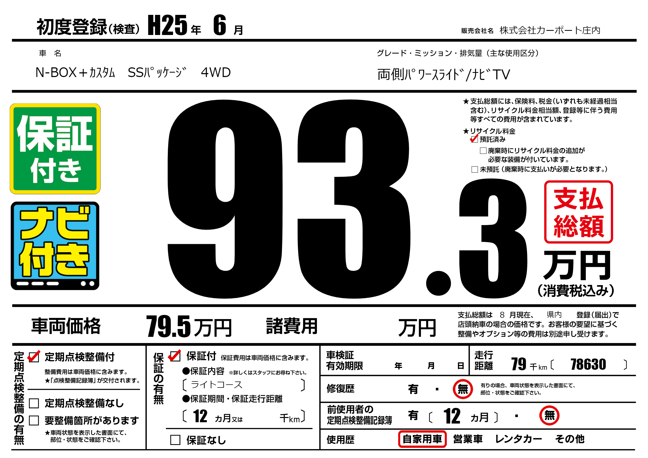| 車名 | N-BOX+カスタム SSパッケージ 4WD | グレード ミッション 排気量 |