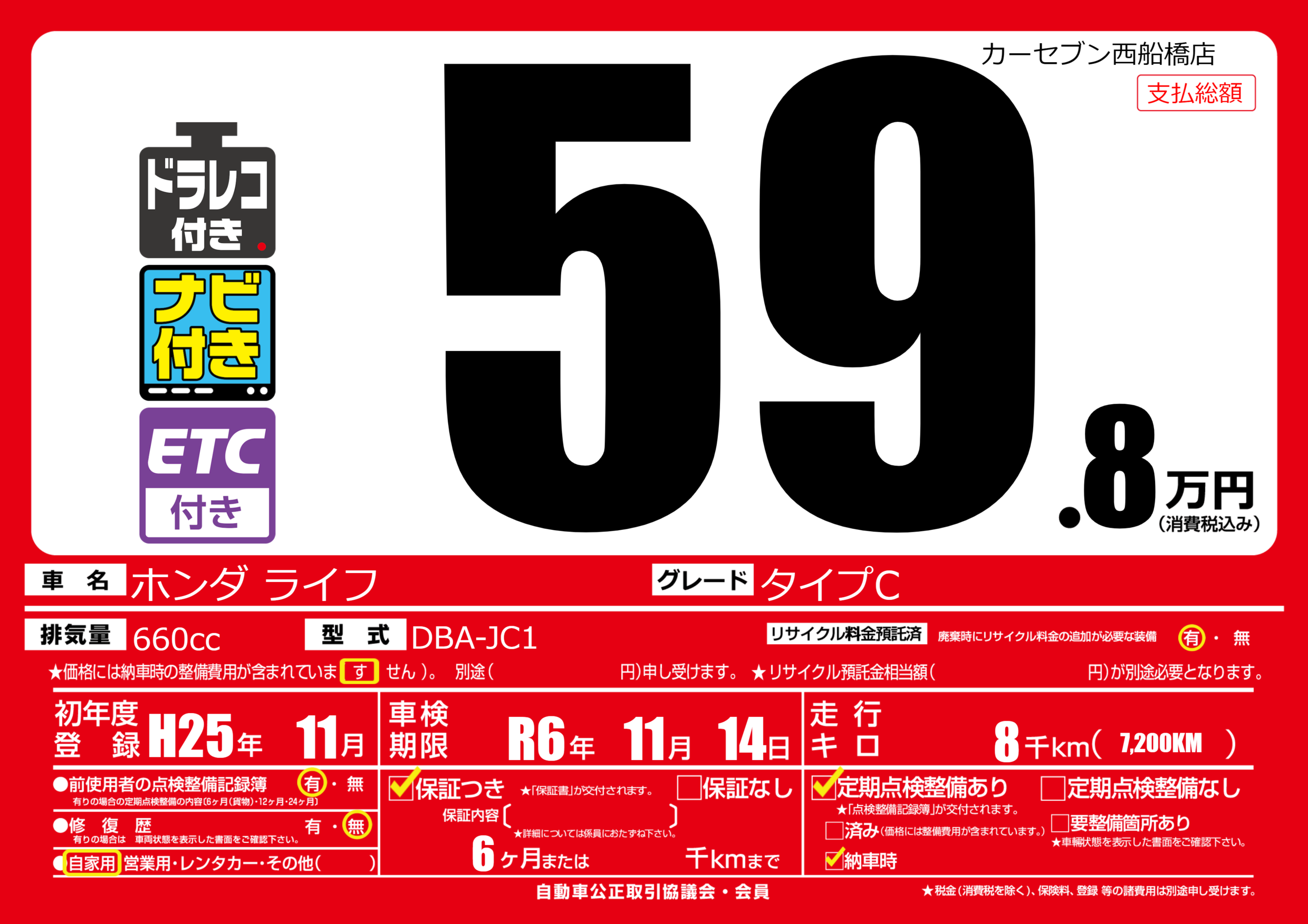 | 車名 | ホンダ ライフ | グレード ミッション 排気量 |