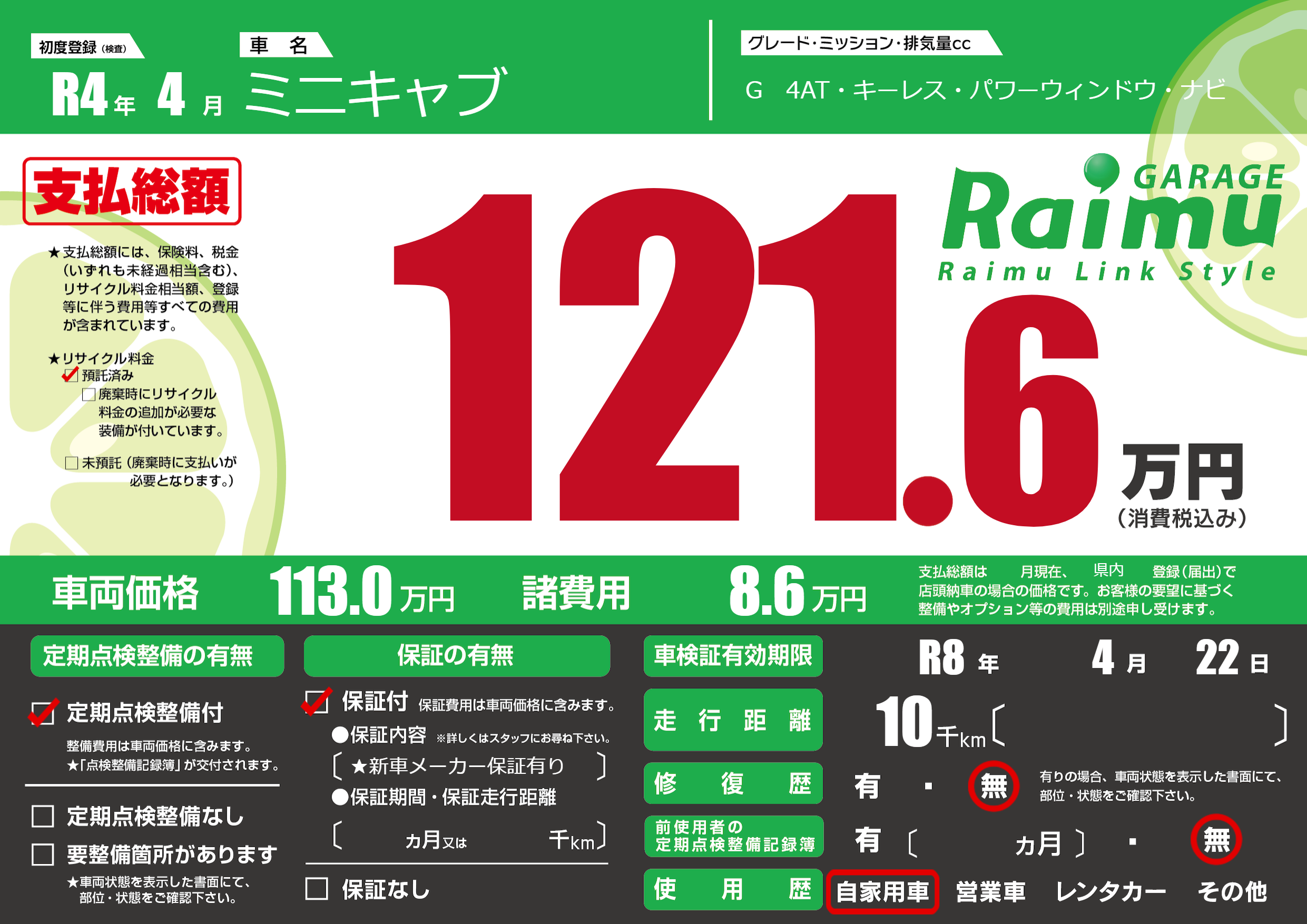 | 走行キロ | 1万km | 初年度登録 | R4年4月 |