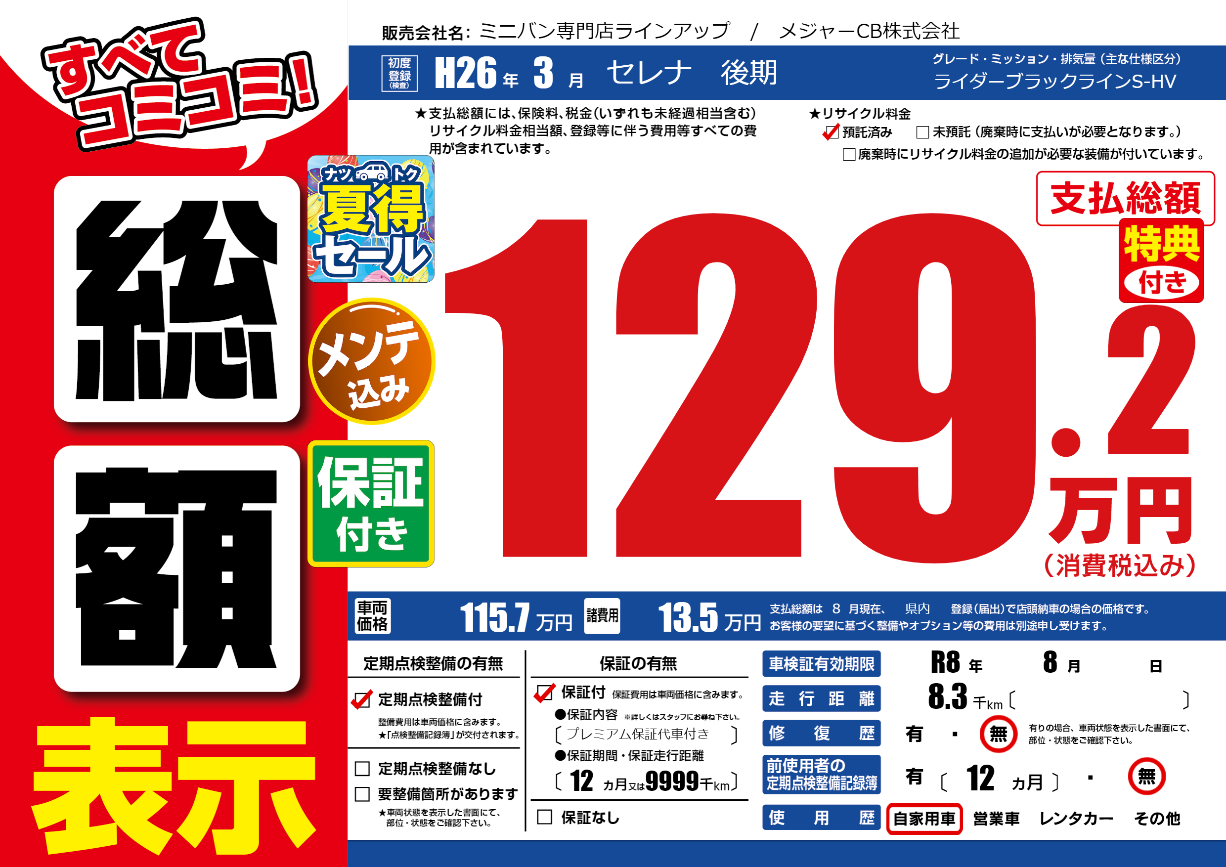 | 車検制限 | R8年 8月 - 日 | ||