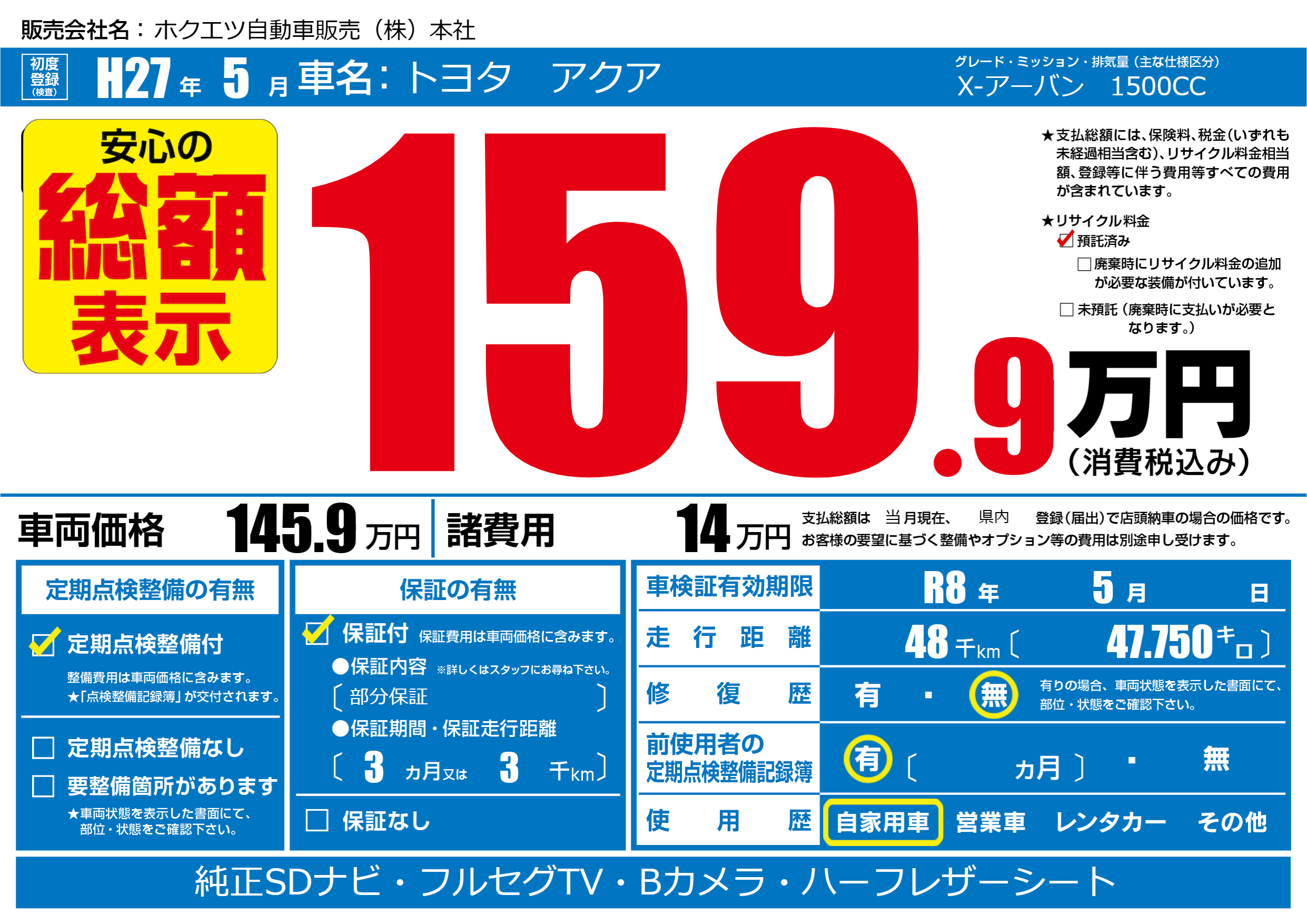 | 車名 | トヨタ アクア | グレード ミッション 排気量 |