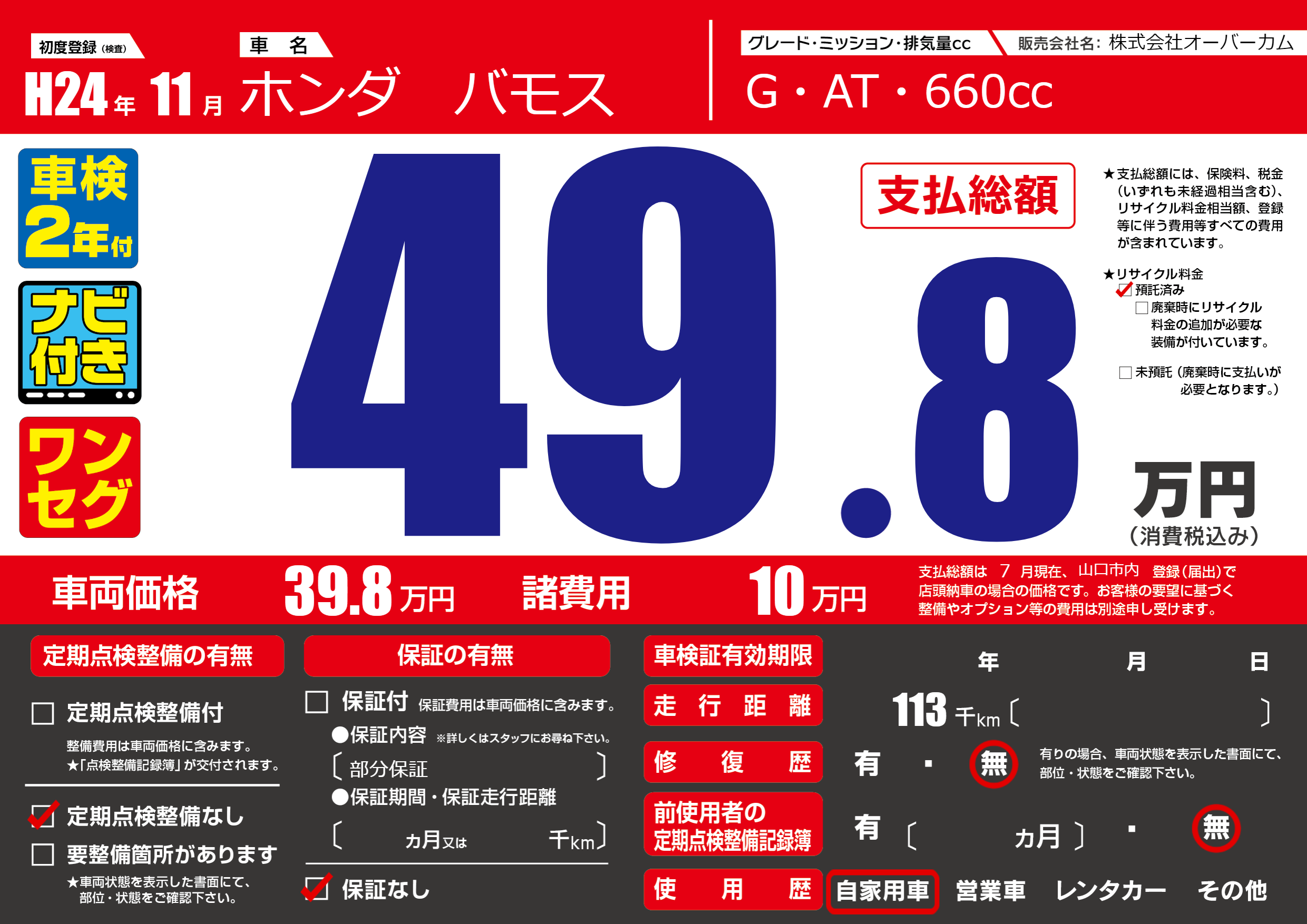 | 車名 | ホンダ バモス | グレード ミッション 排気量 |