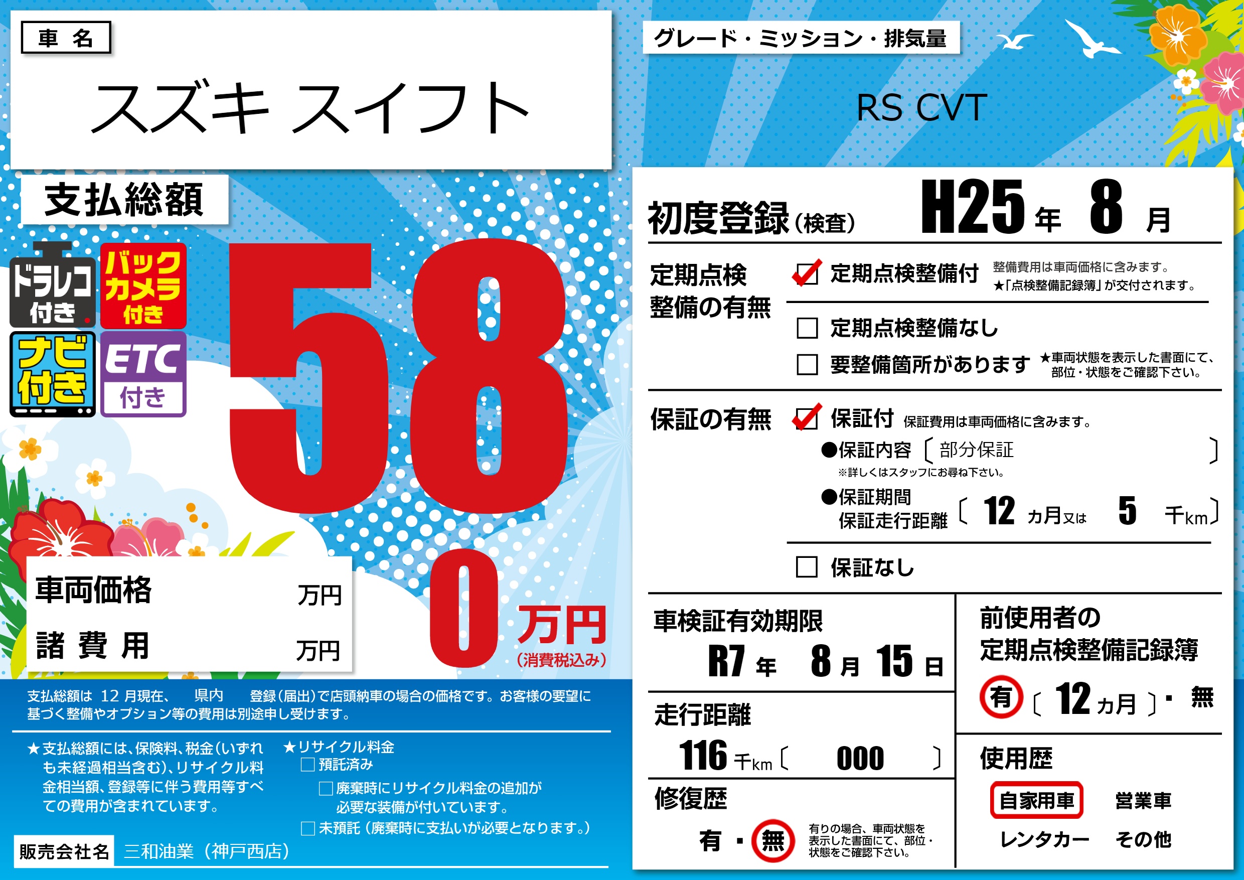 | 車名 | スズキ スイフト | グレード ミッション 排気量 |