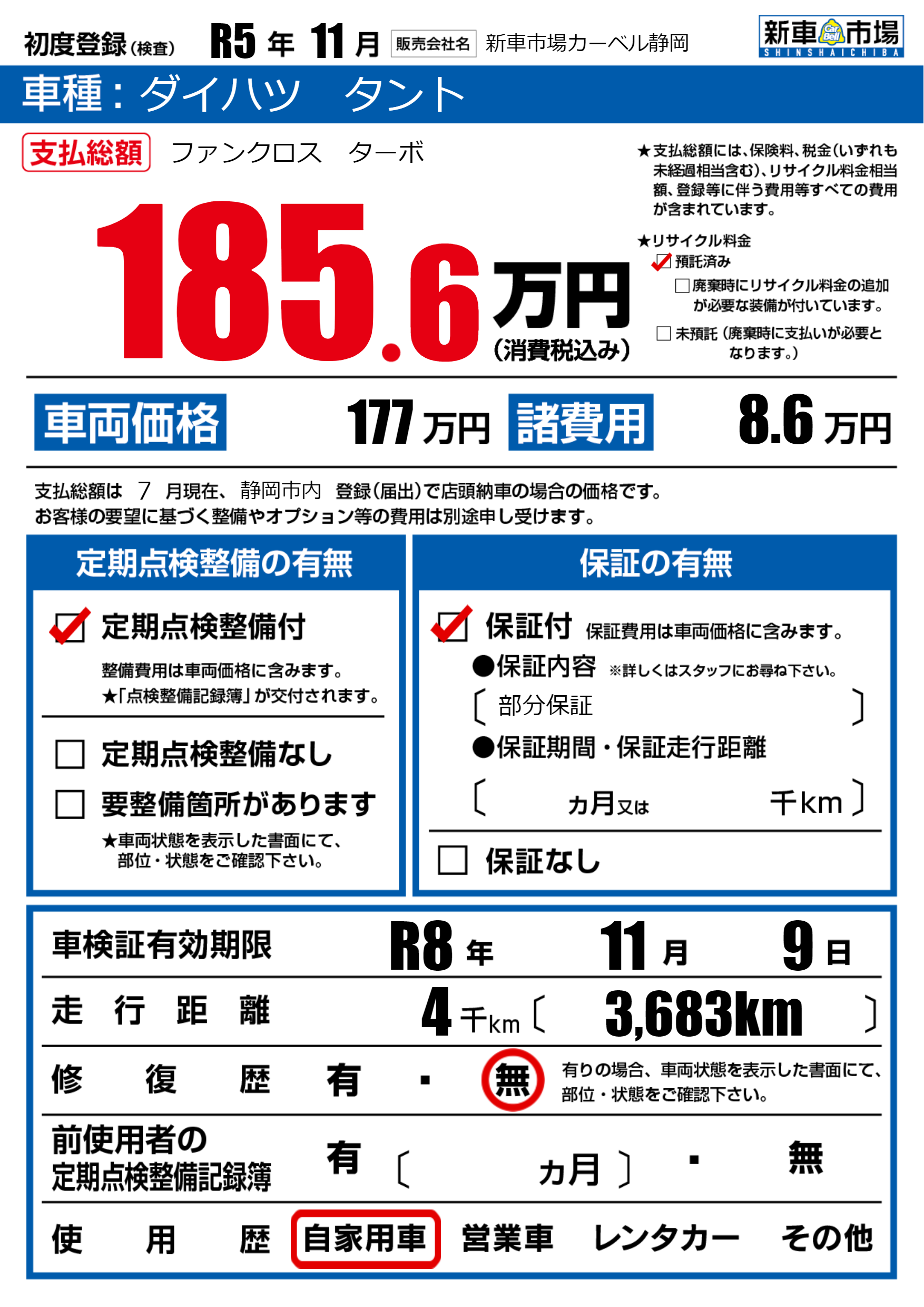 | 走行キロ | 0.4万km | 初年度登録 | R5年11月 |