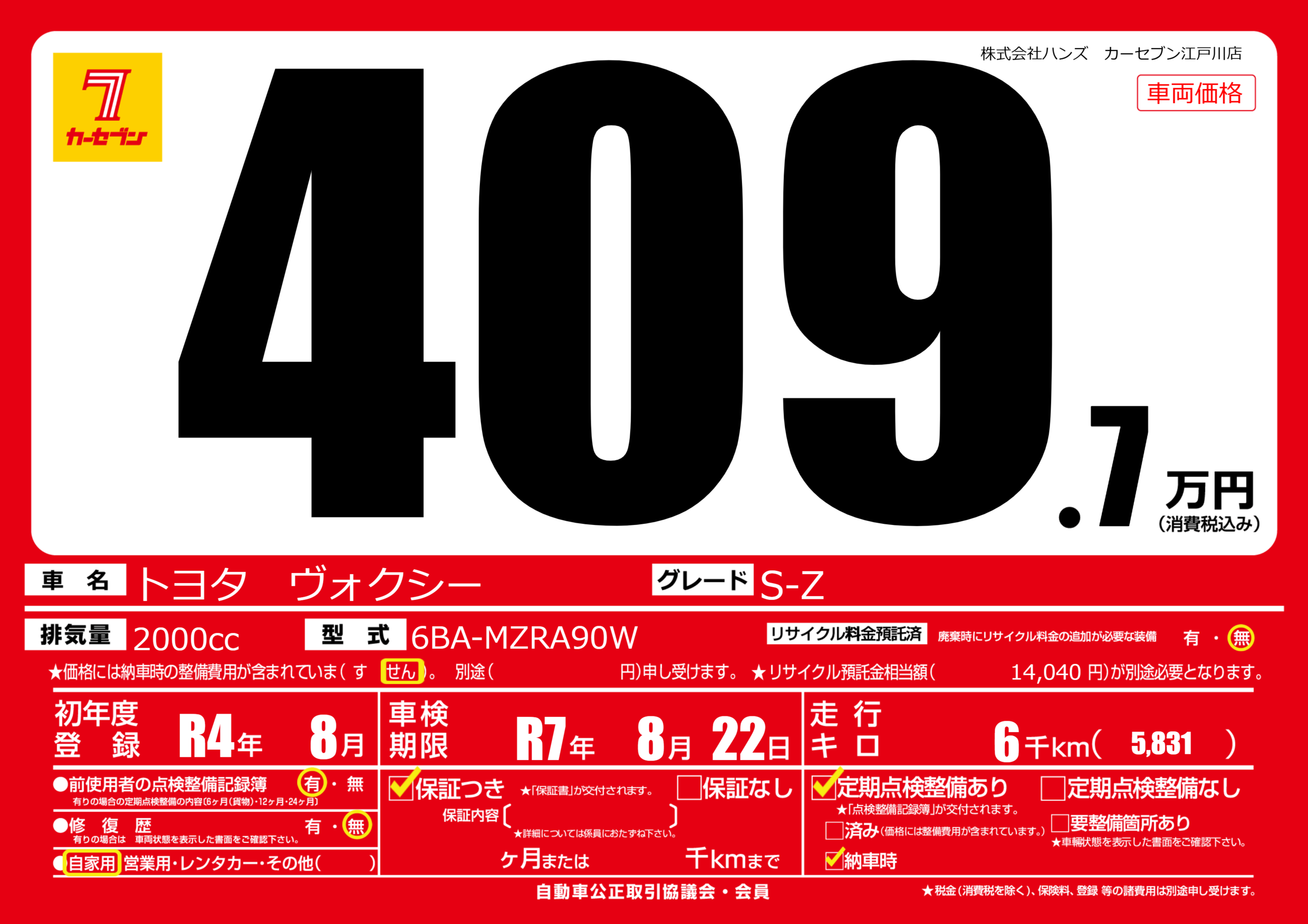 | 車名 | トヨタ ヴォクシー | グレード ミッション 排気量 |