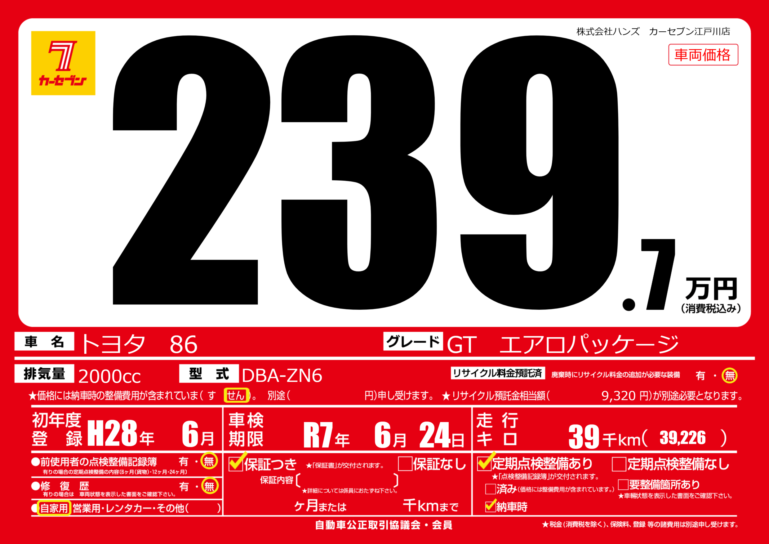 | 車名 | トヨタ 86 | グレード ミッション 排気量 |