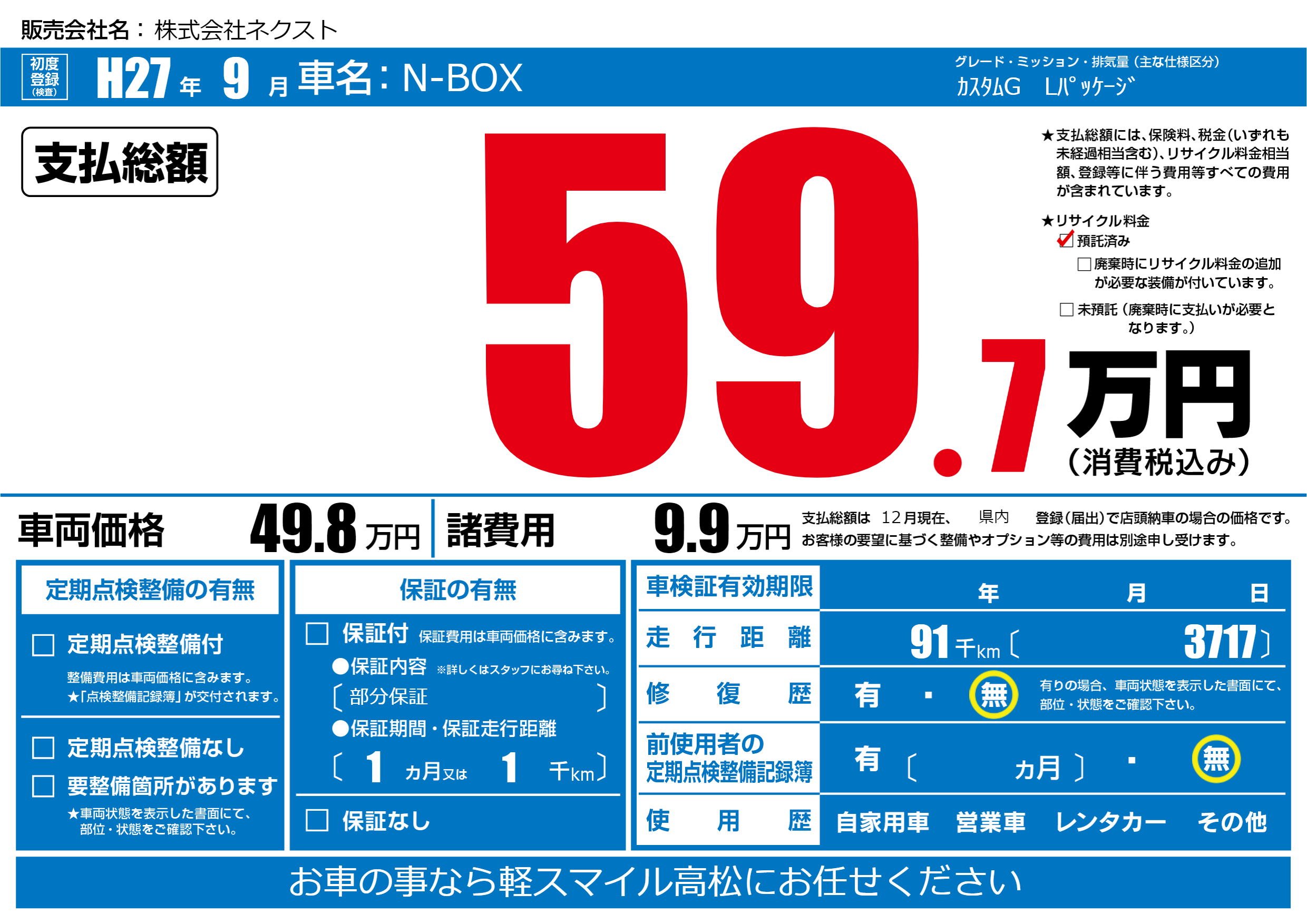 | 走行キロ | 9.1万km | 初年度登録 | H27年9月 |