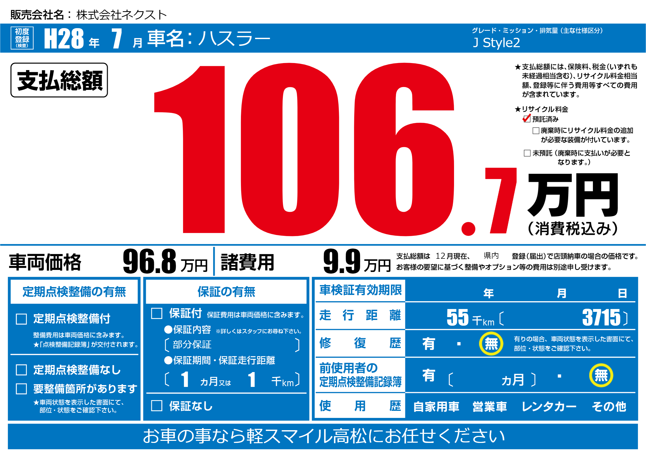 | 車名 | ハスラー | グレード ミッション 排気量 |
