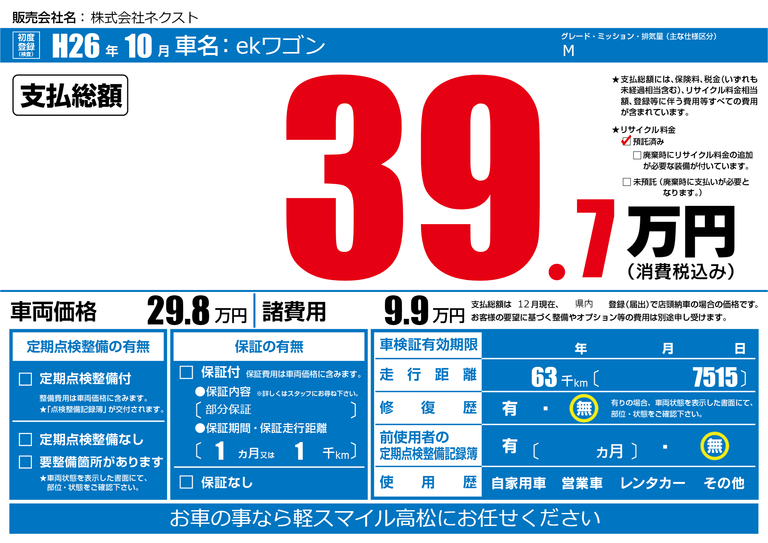 | 車名 | ekワゴン | グレード ミッション 排気量 |