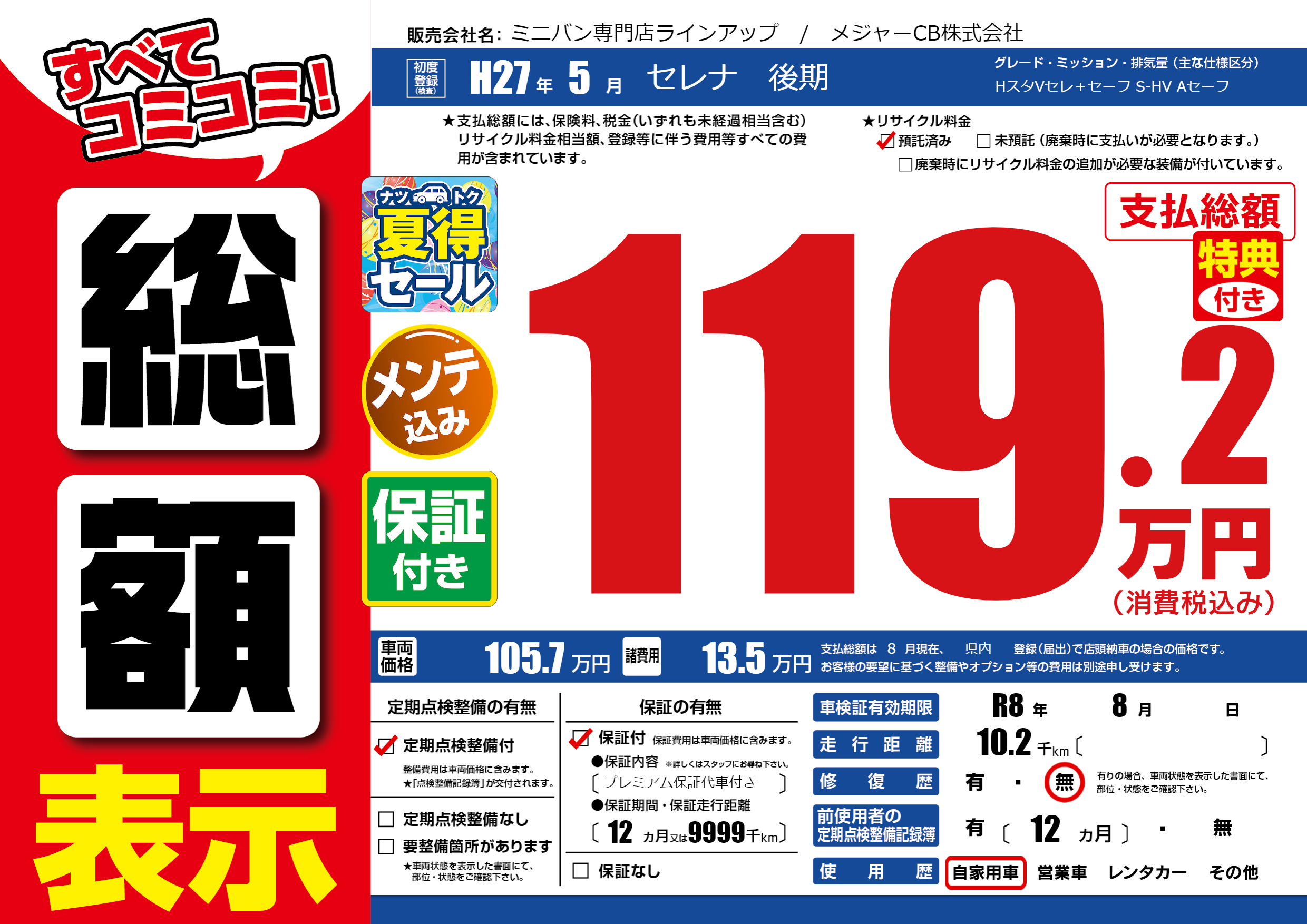 | 車名 | セレナ 後期 | グレード ミッション 排気量 |