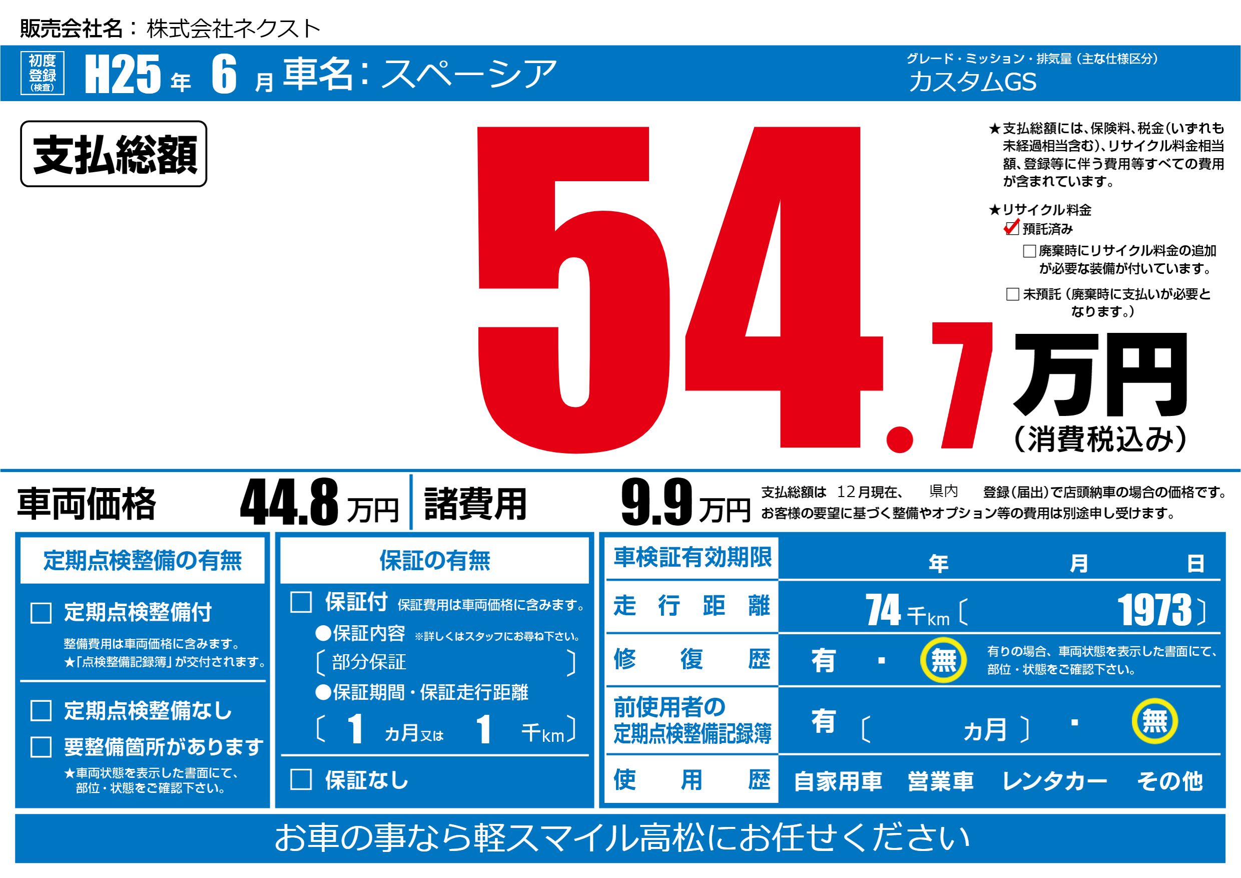| 車名 | スペーシア | グレード ミッション 排気量 |