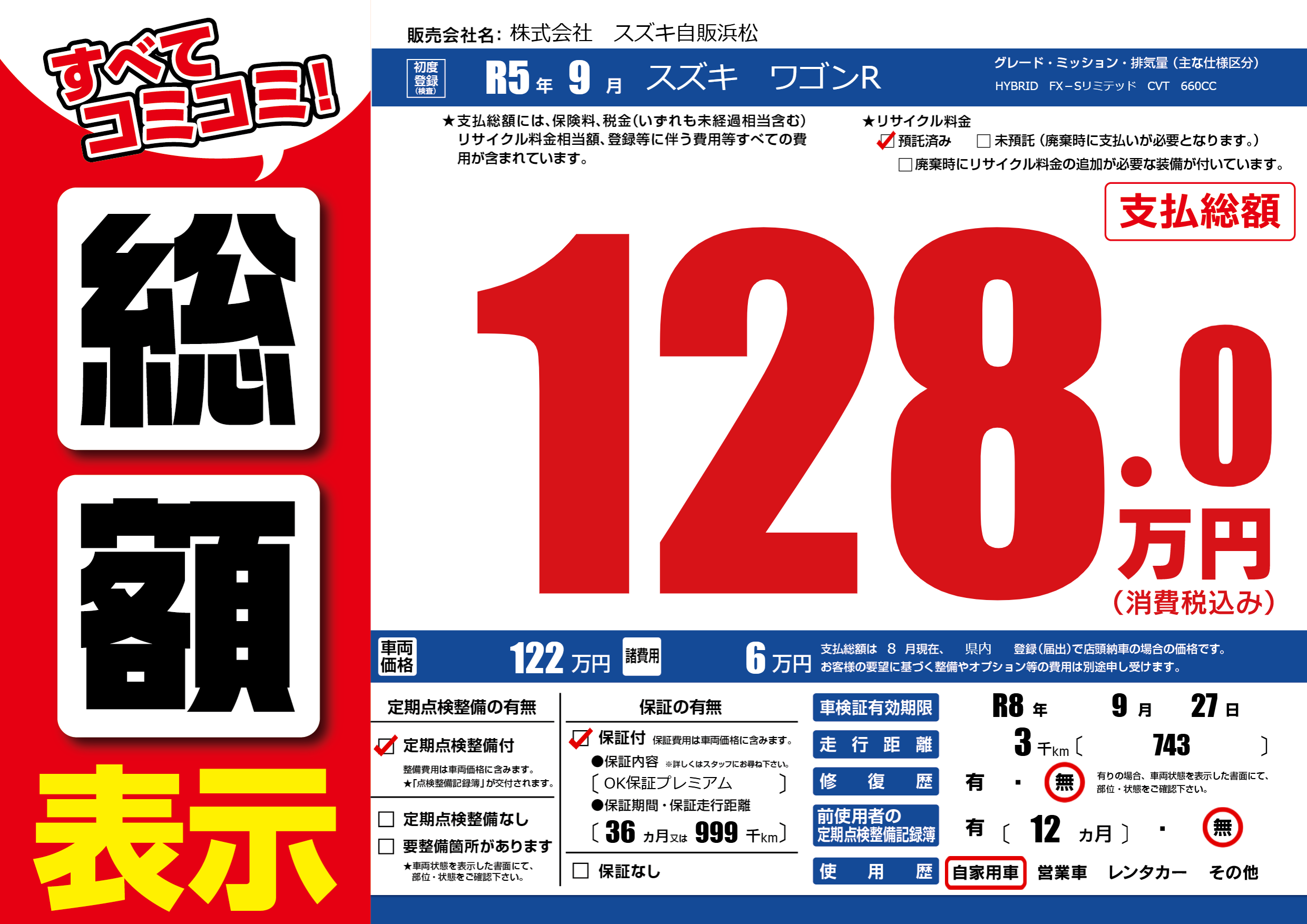 | 走行キロ | 0.3万km | 初年度登録 | R5年9月 |