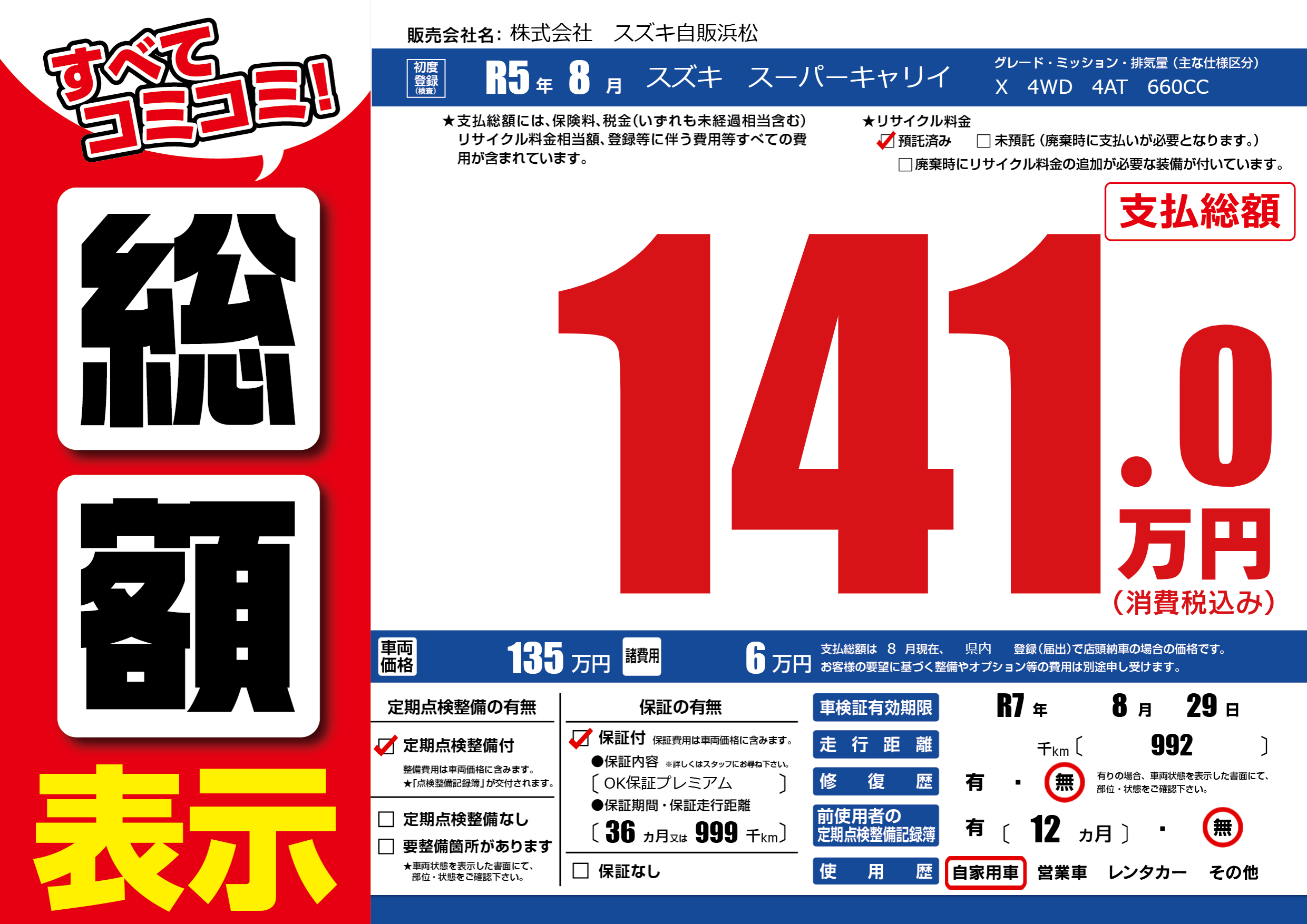 | 車名 | スズキ スーパーキャリイ | グレード ミッション 排気量 |