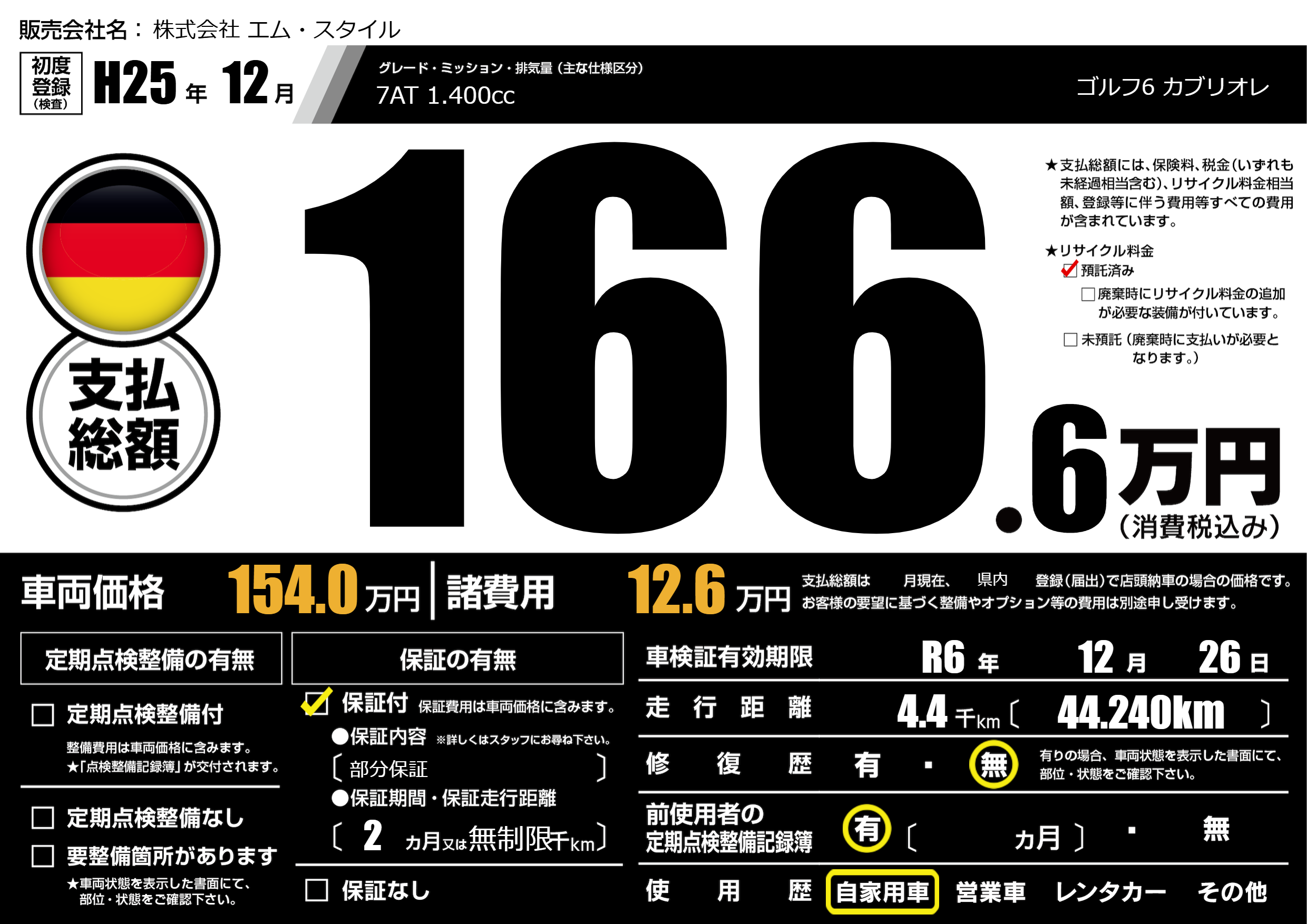 | 車名 | ゴルフ6 カブリオレ | グレード ミッション 排気量 |