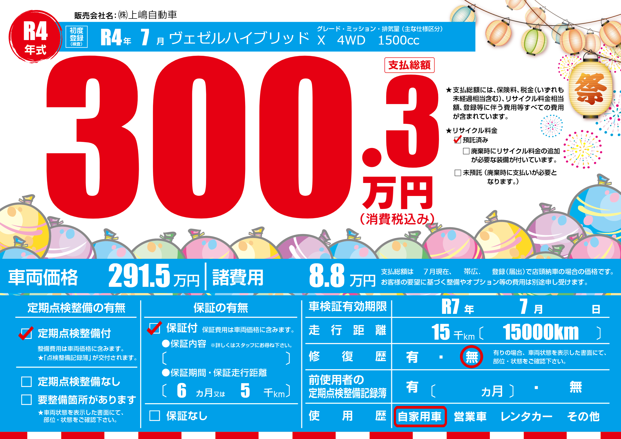 | 車名 | ヴェゼルハイブリッド | グレード ミッション 排気量 |