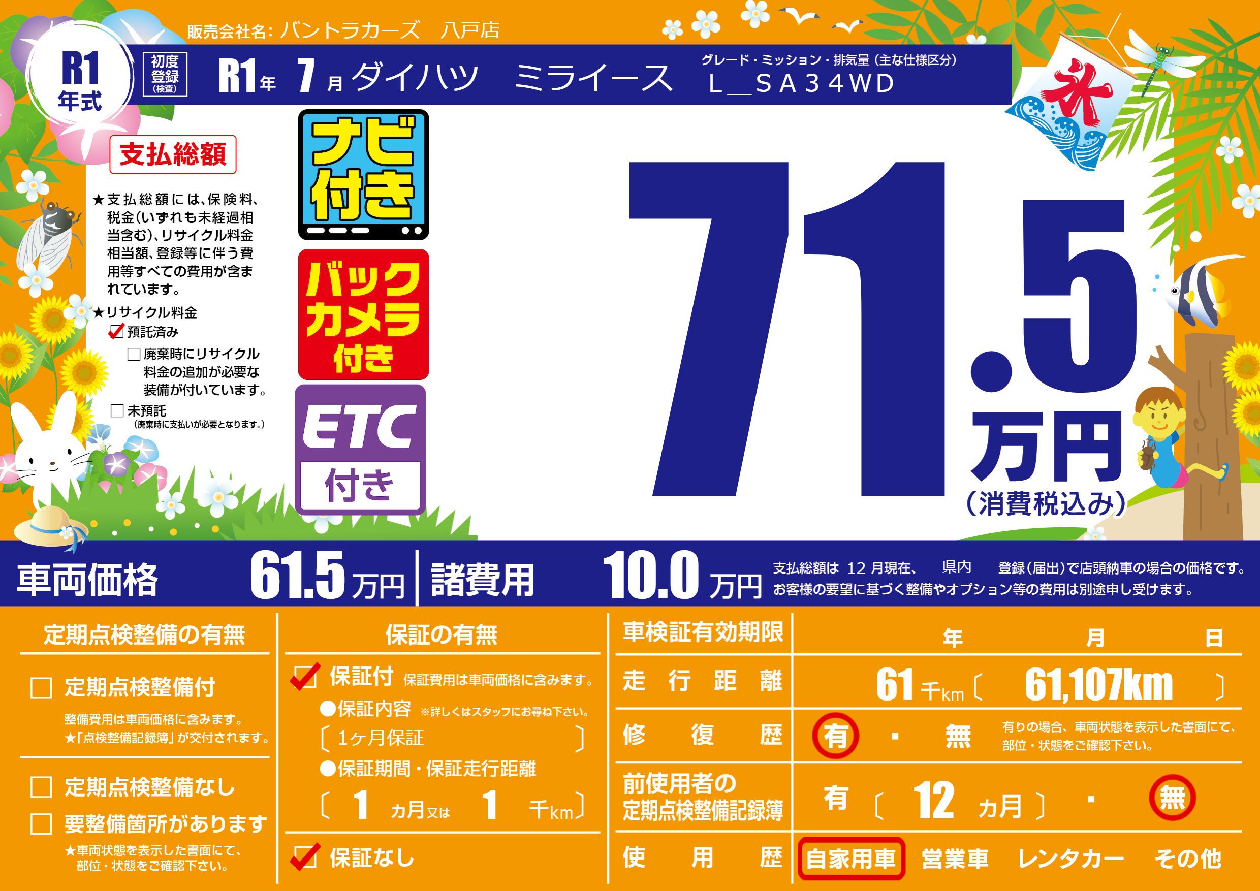| 走行キロ | 6.1万km | 初年度登録 | R1年7月 |