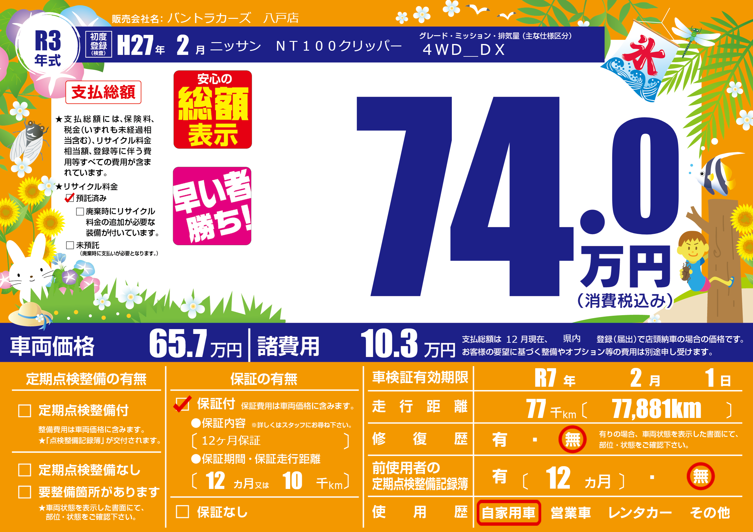 | 走行キロ | 7.7万km | 初年度登録 | H27年2月 |