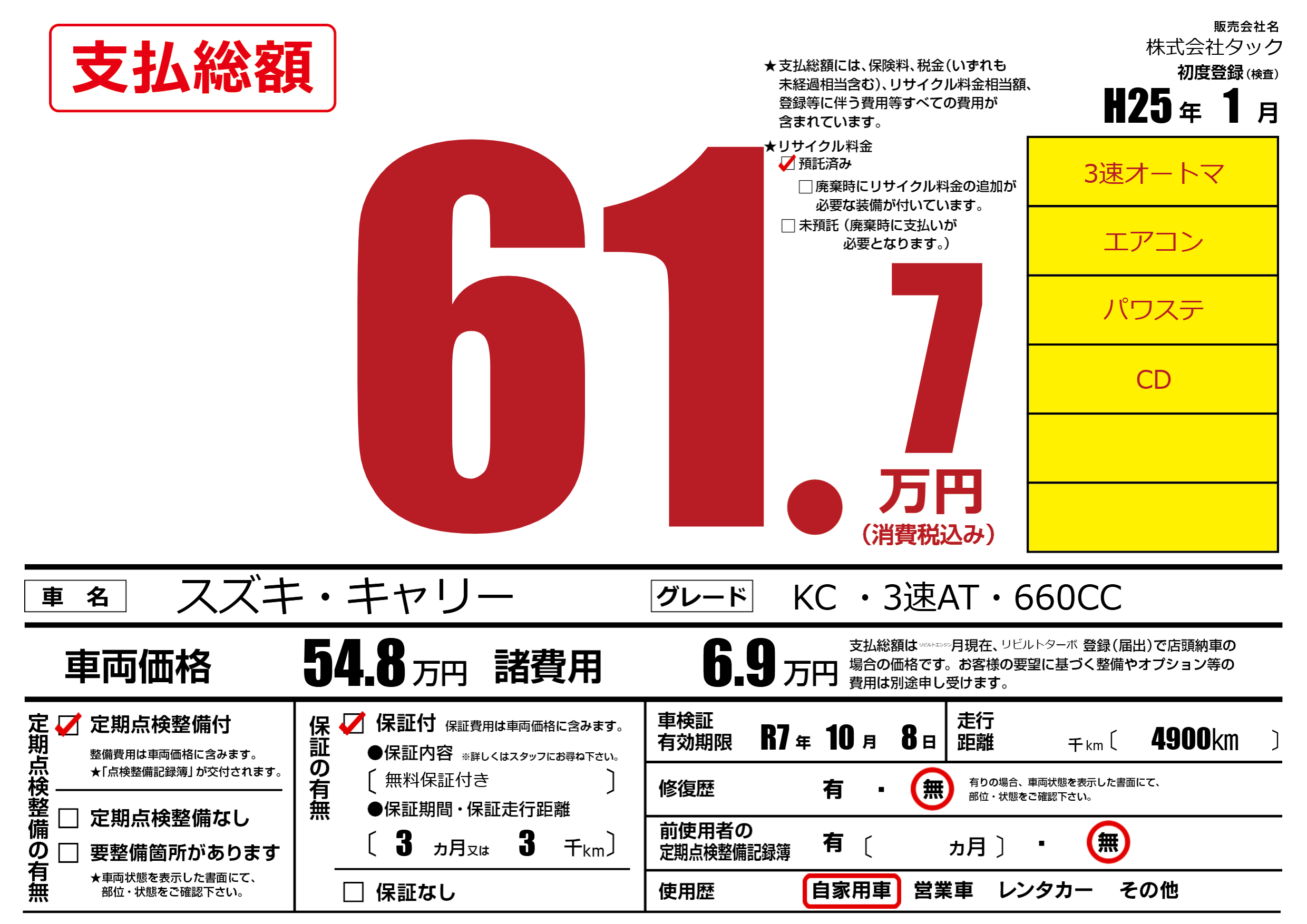 | 車検制限 | R7年 10月 8日 | ||