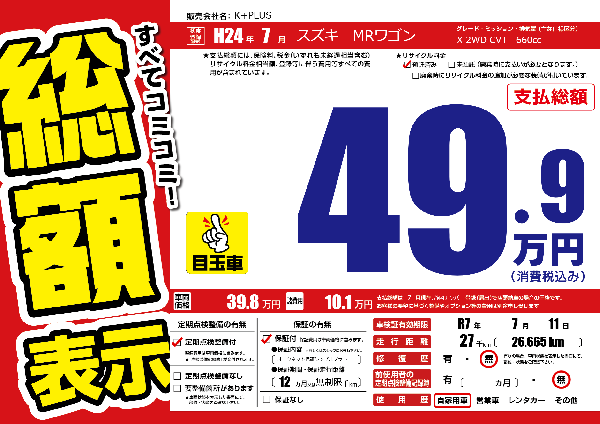 | 車名 | スズキ MRワゴン | グレード ミッション 排気量 |