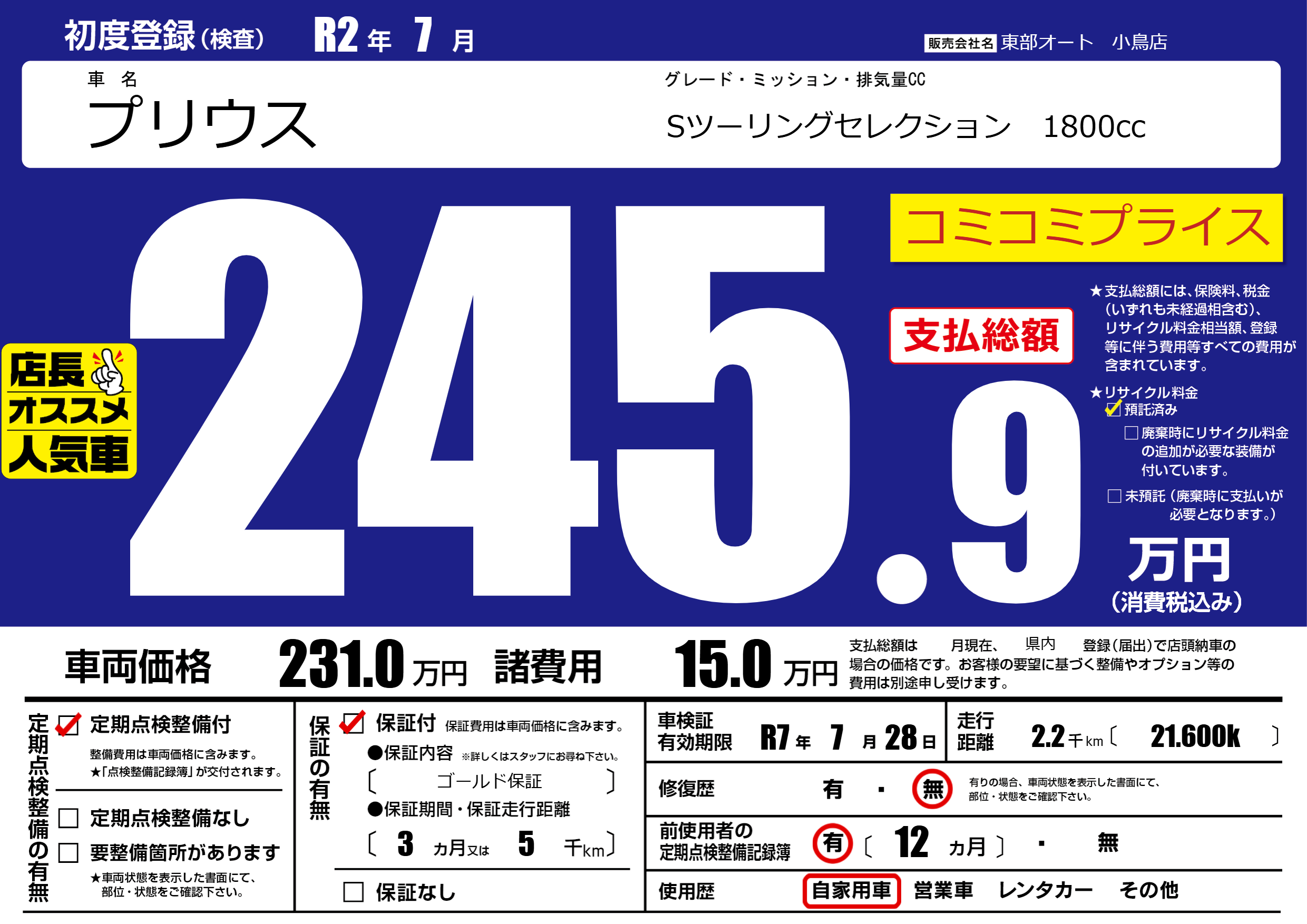 | 車名 | プリウス | グレード ミッション 排気量 |