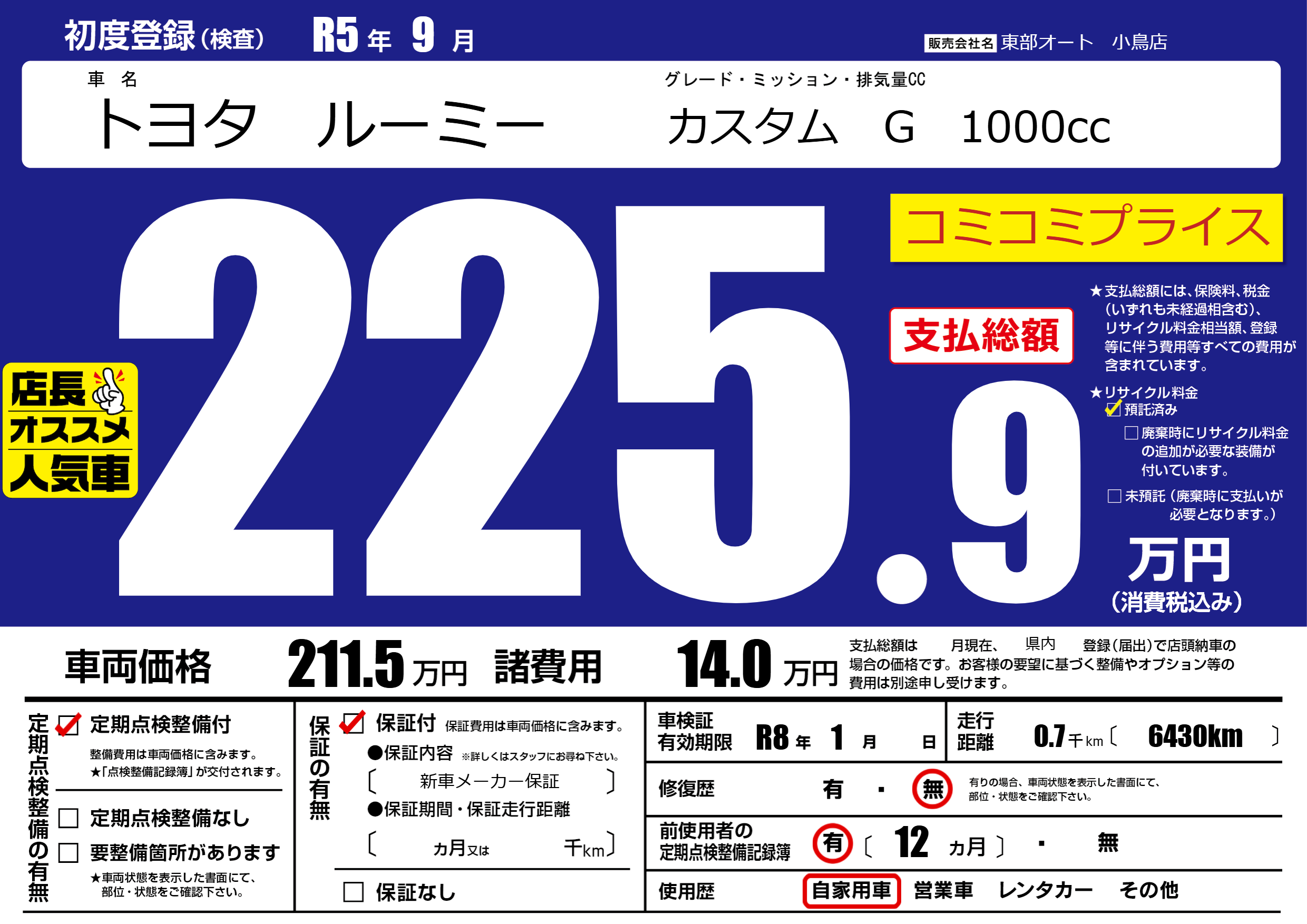 あり | リサイクル預託金相当額 | ( 0円)が別途必要 |