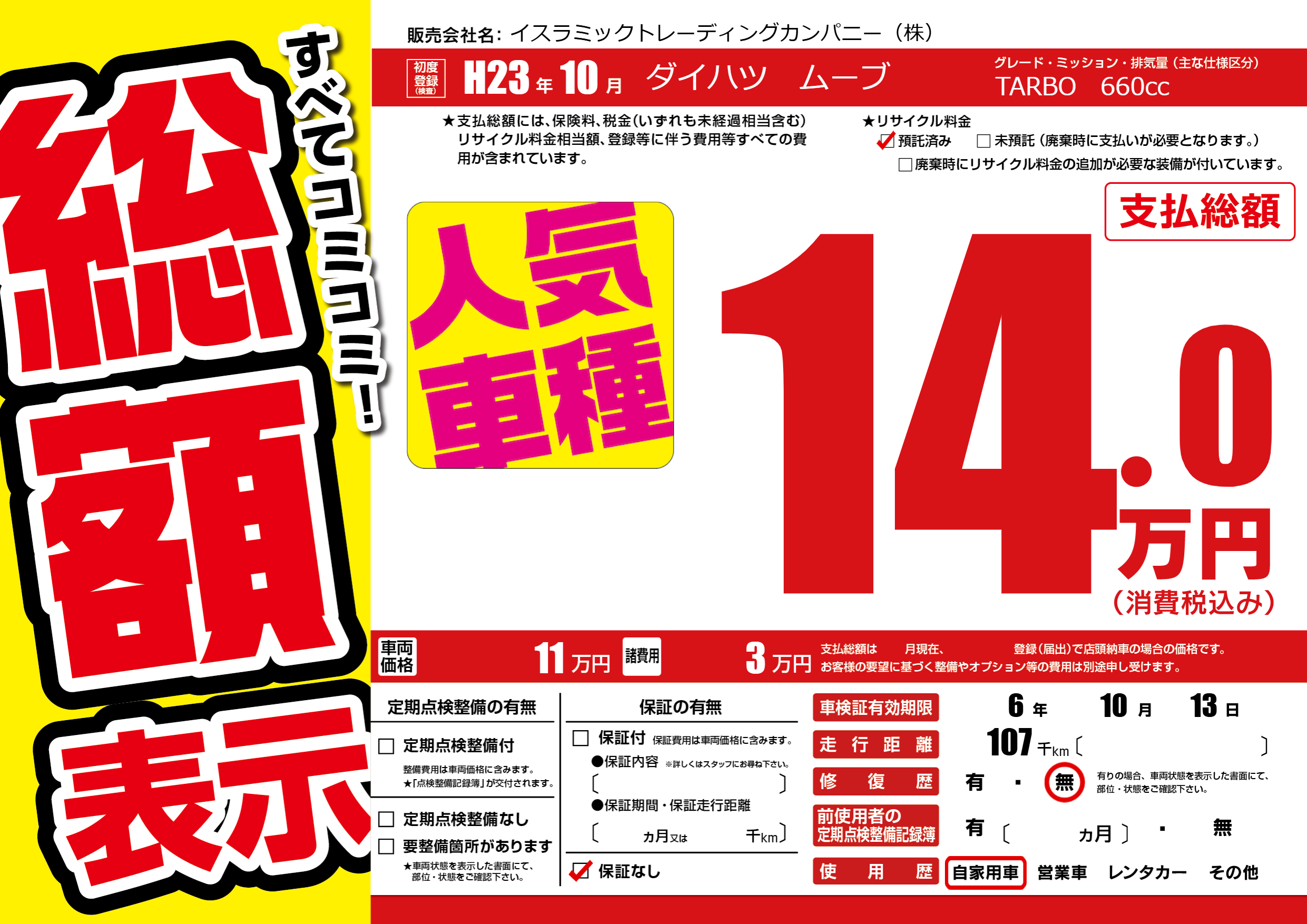 | 走行キロ | 10.7万km | 初年度登録 | H23年10月 |