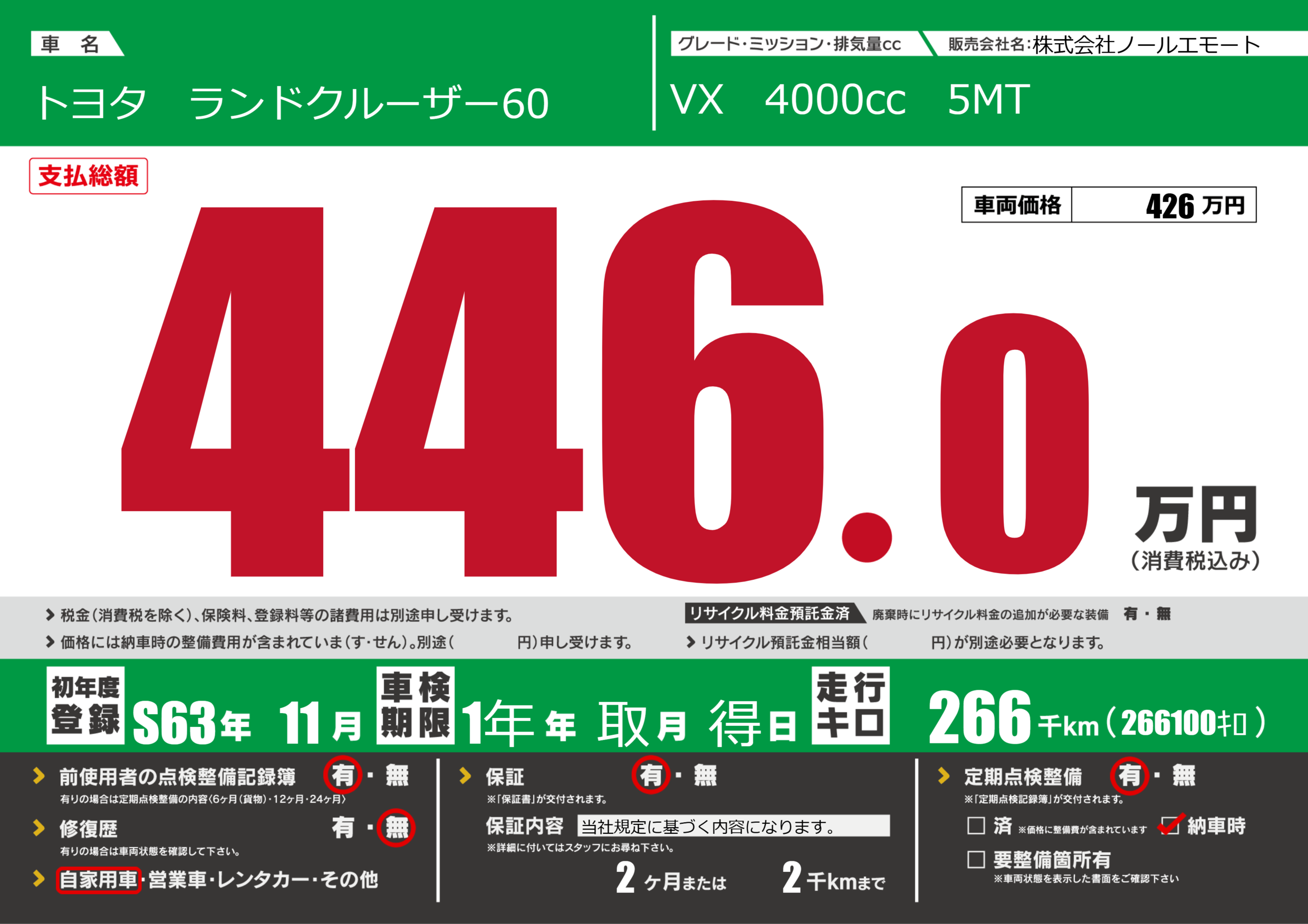 | 走行キロ | 26.6万km | 初年度登録 | S63年11月 |