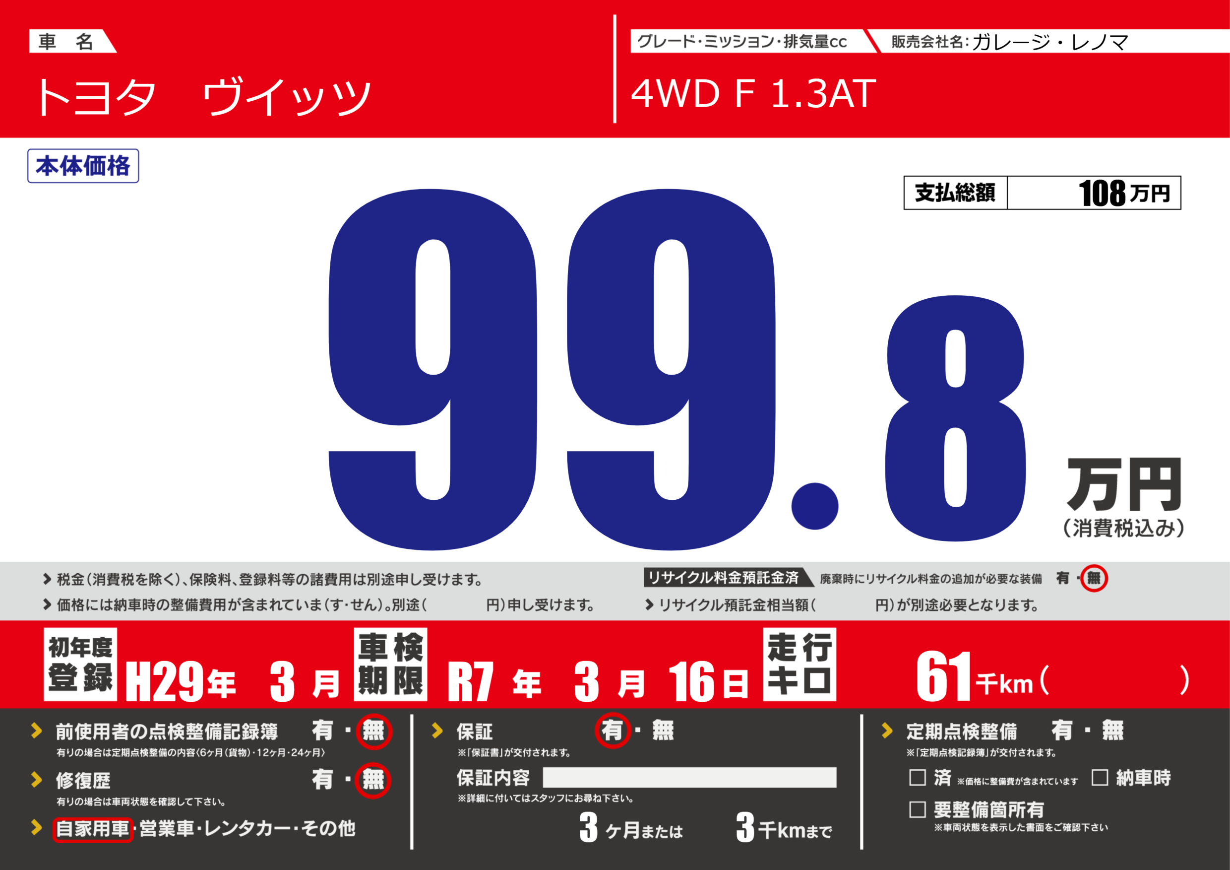 | 車名 | トヨタ ヴイッツ | グレード ミッション 排気量 |