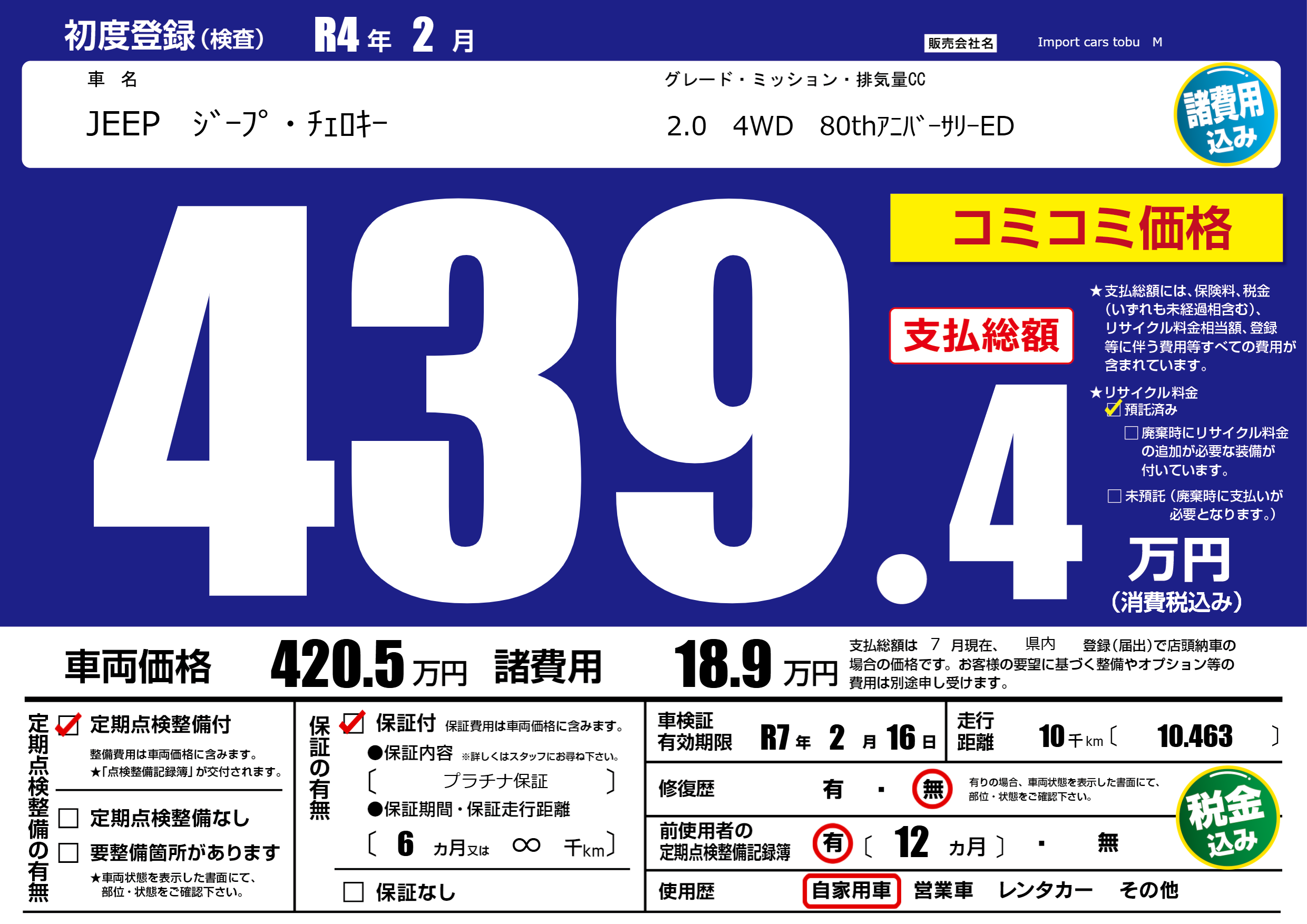 | 車名 | JEEP ジープ・チェロキー | グレード ミッション 排気量 |