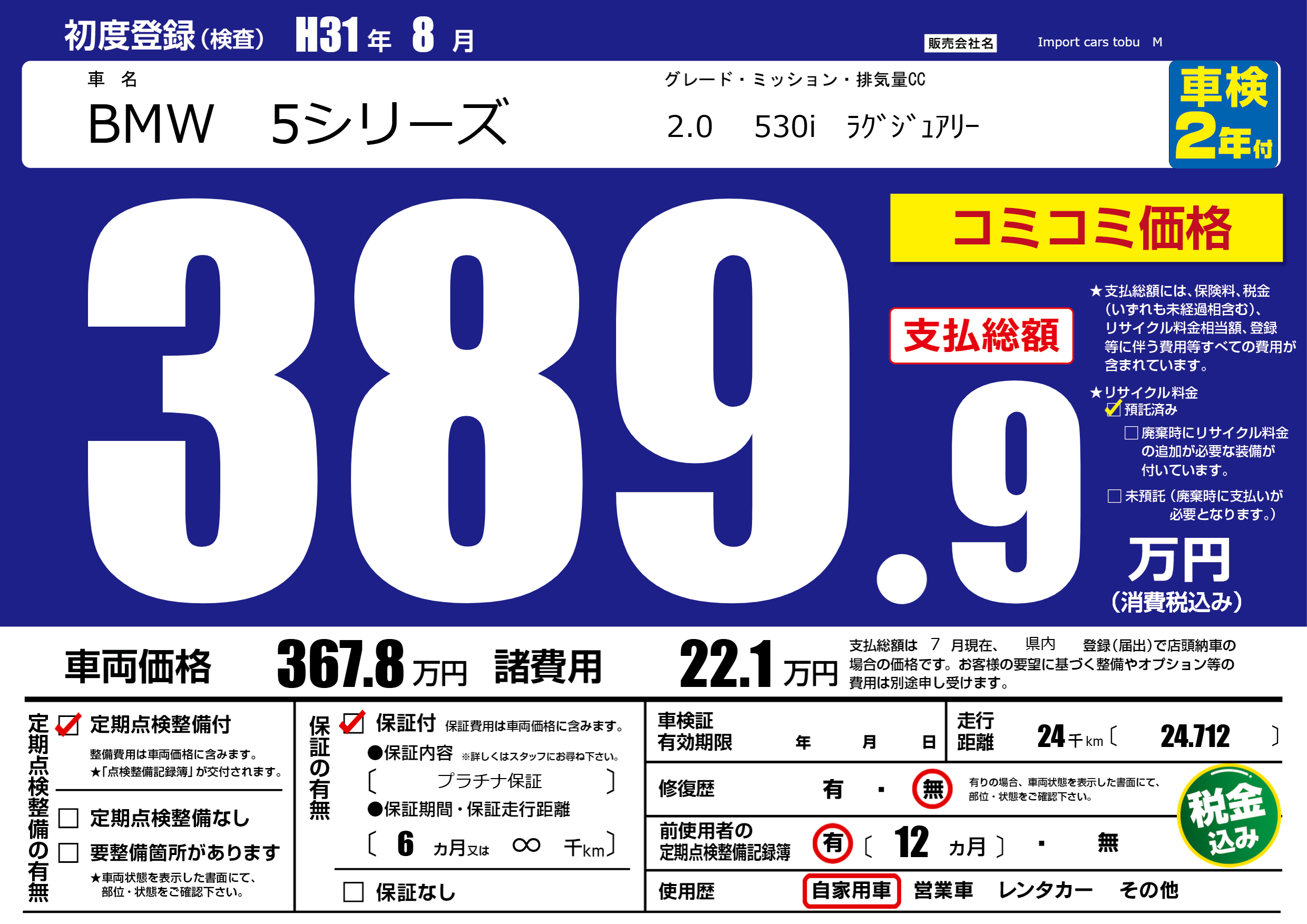 | 車名 | BMW 5シリーズ | グレード ミッション 排気量 |