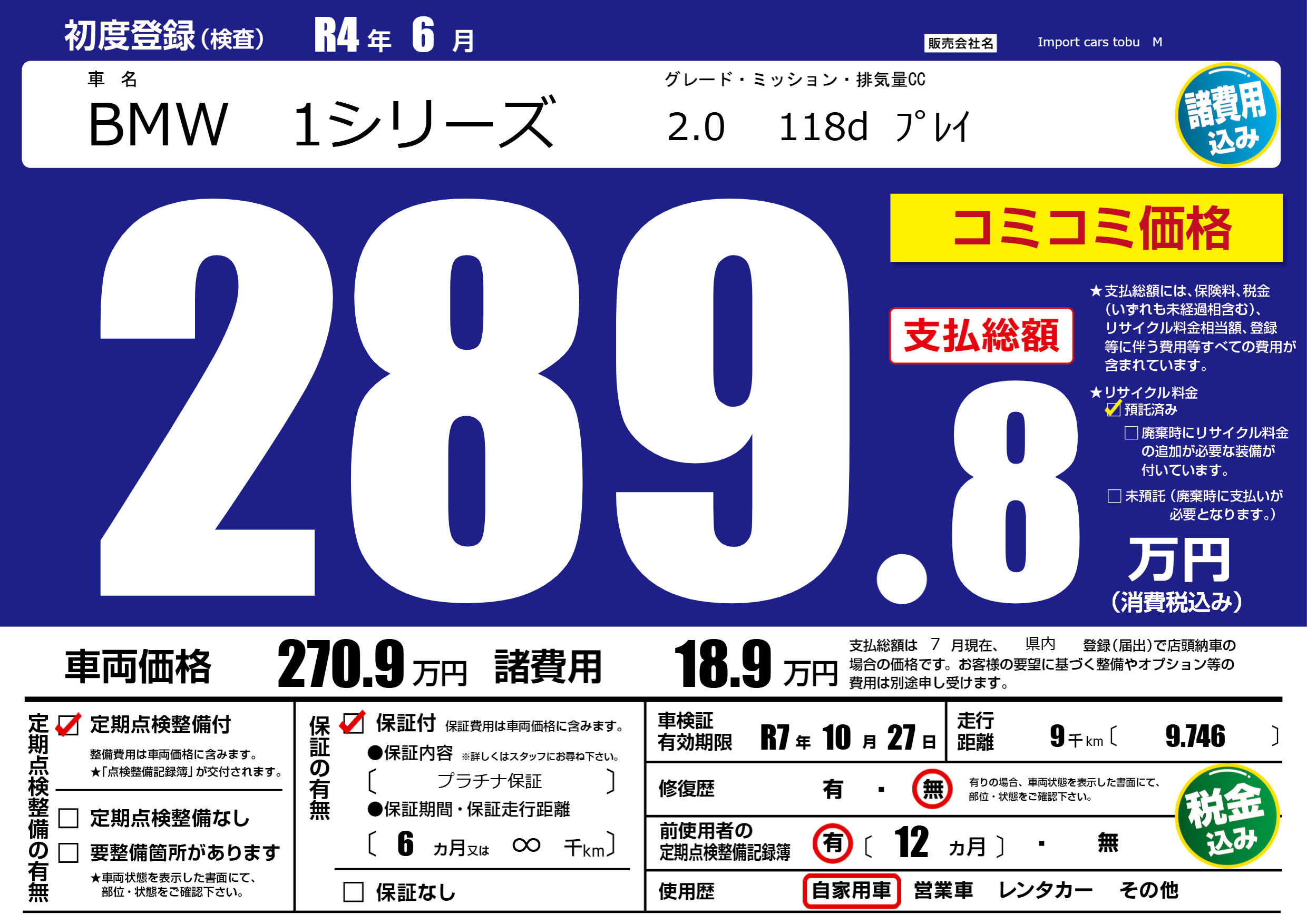 保証付き 保証内容( プラチナ保証) 6ヶ月または(∞)千kmまで |