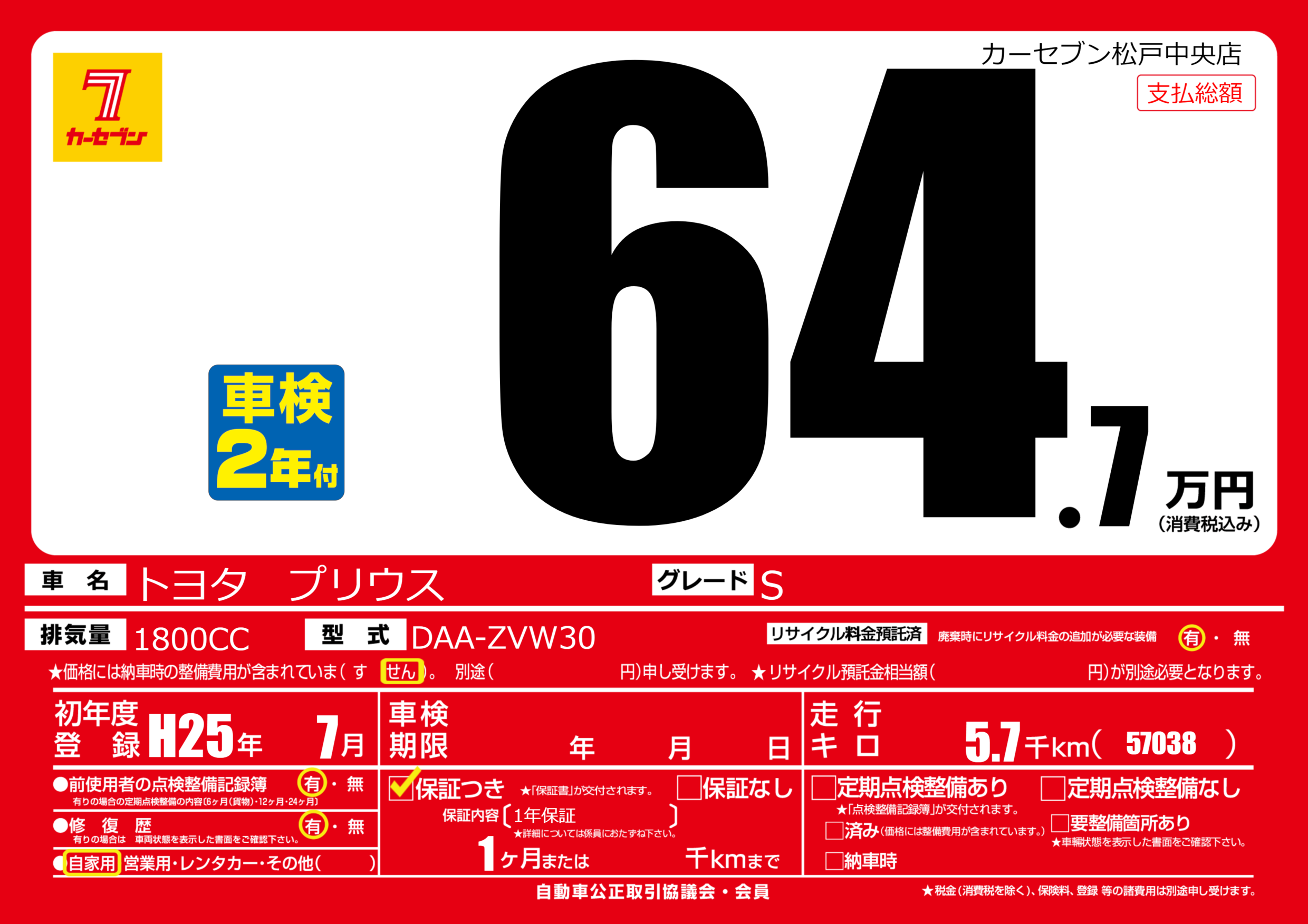 | 走行キロ | 0.5万km | 初年度登録 | H25年7月 |