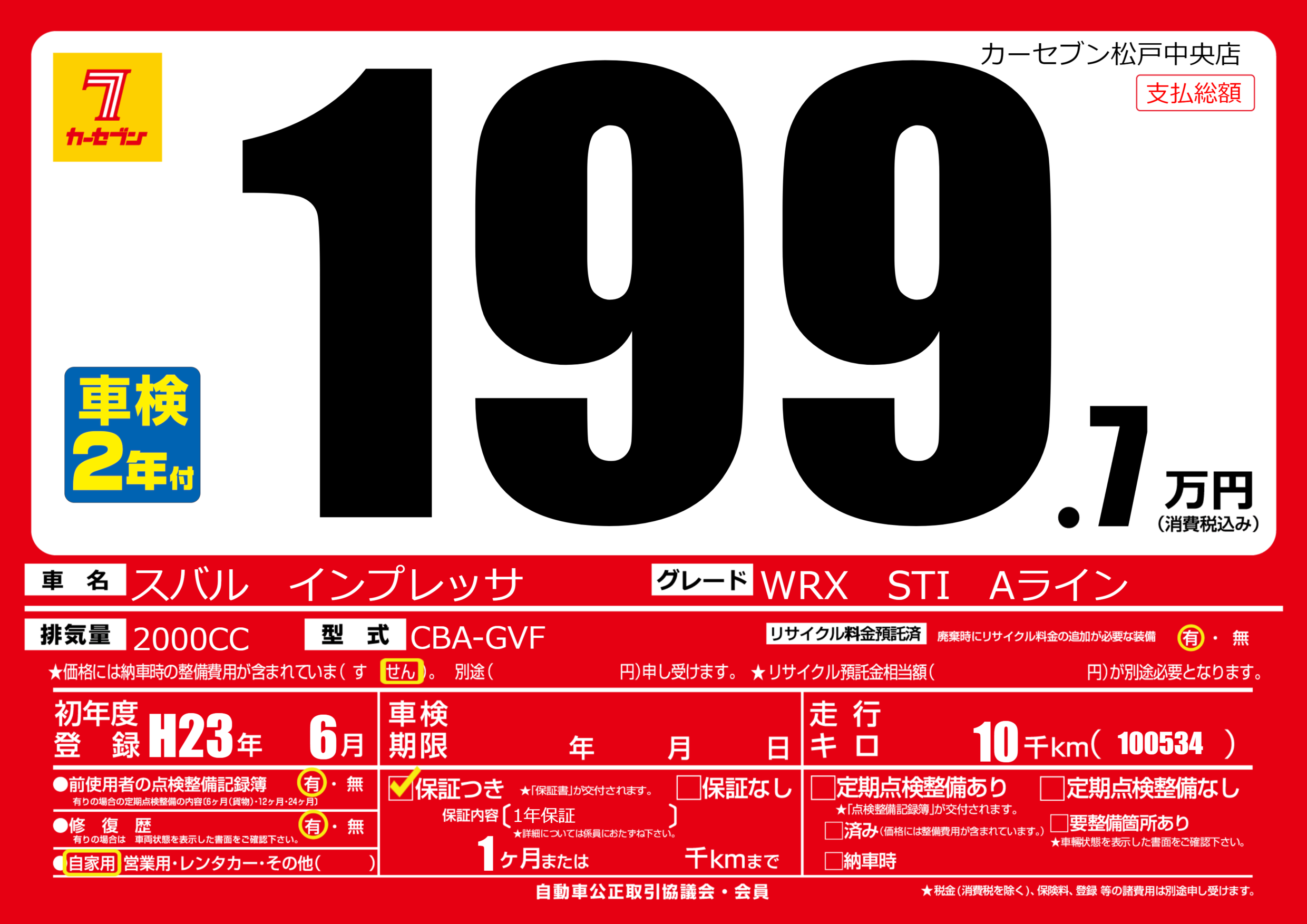 | 車名 | スバル インプレッサ | グレード ミッション 排気量 |