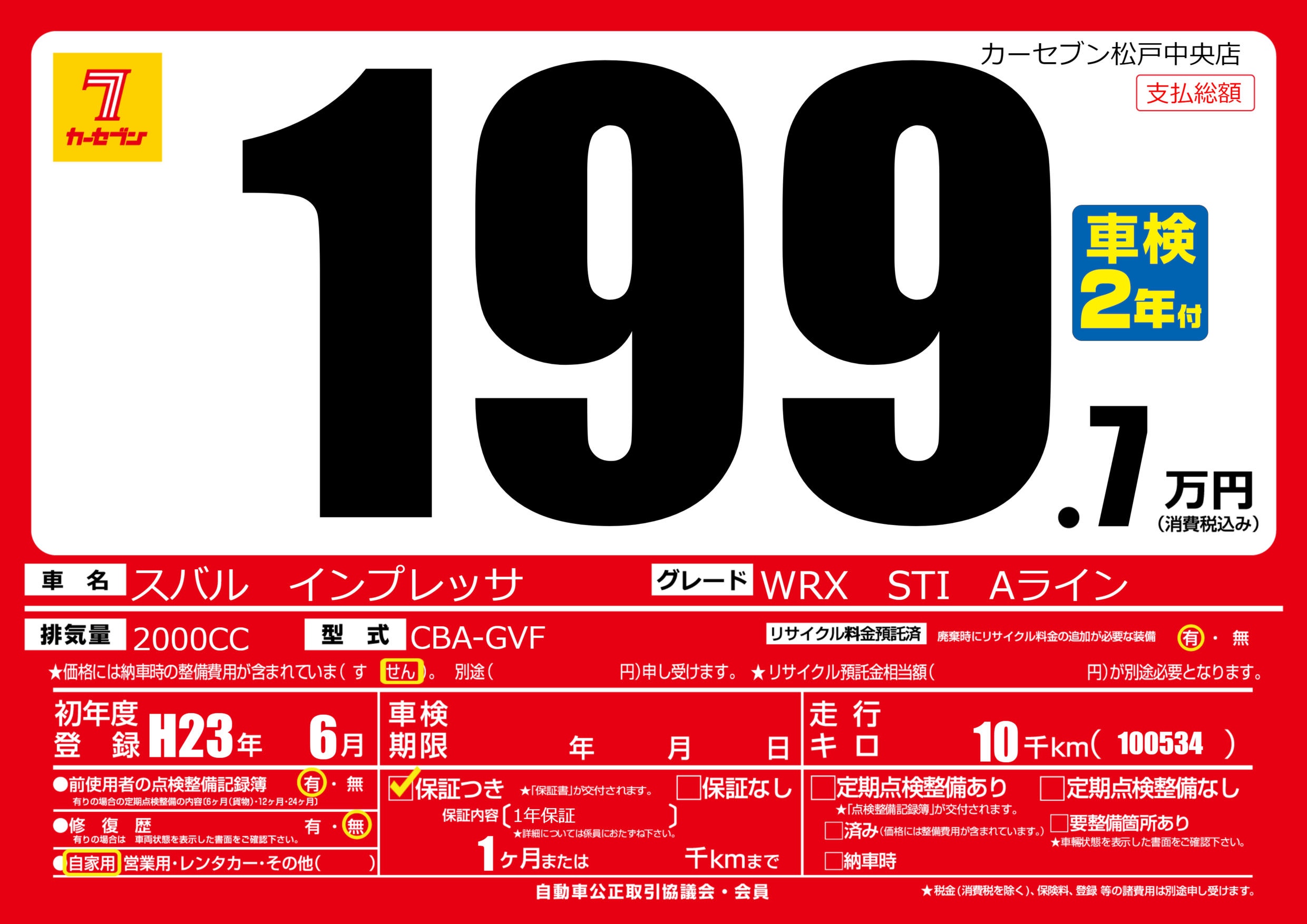 | 車名 | スバル インプレッサ | グレード ミッション 排気量 |