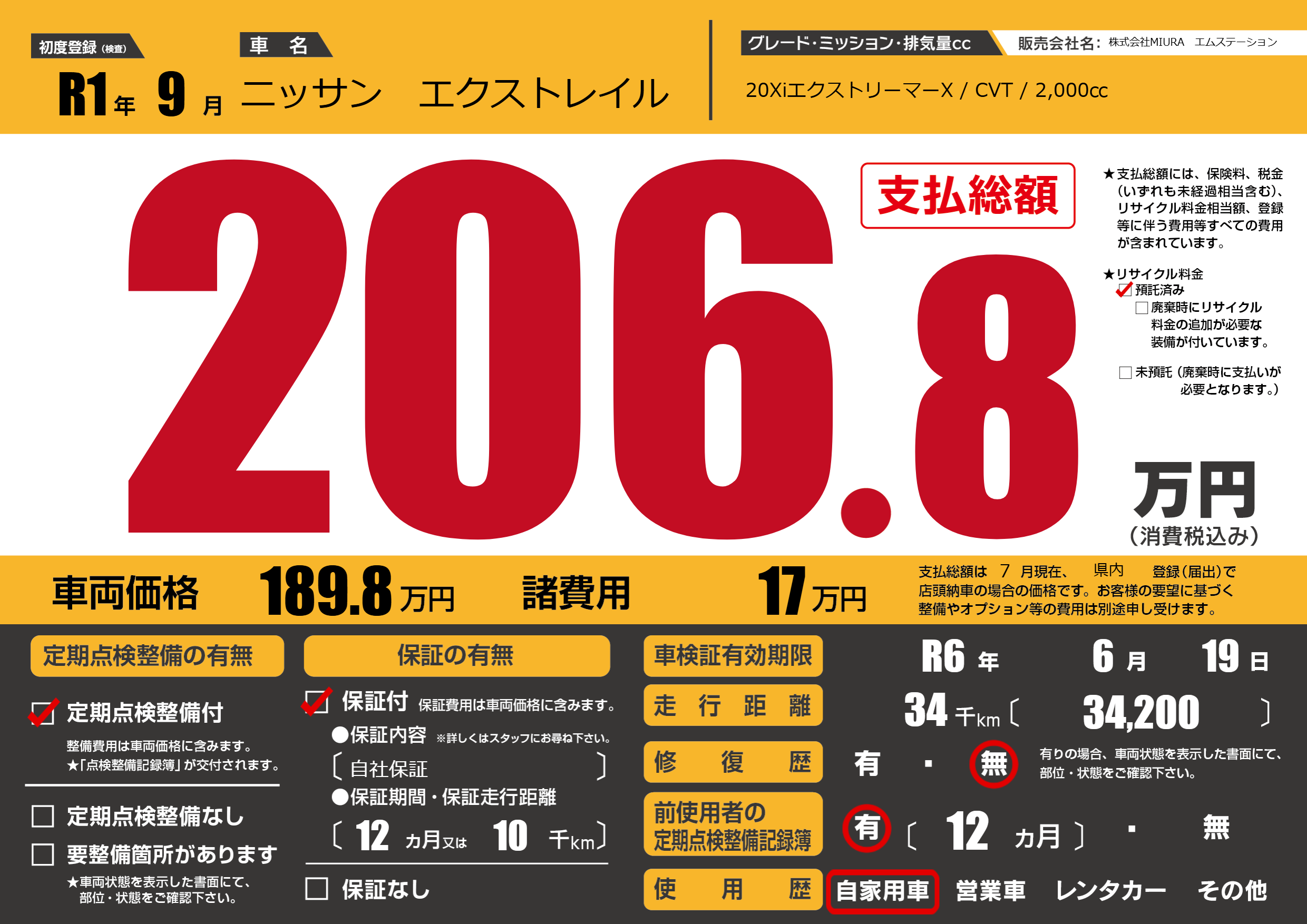 | 走行キロ | 3.4万km | 初年度登録 | R1年9月 |