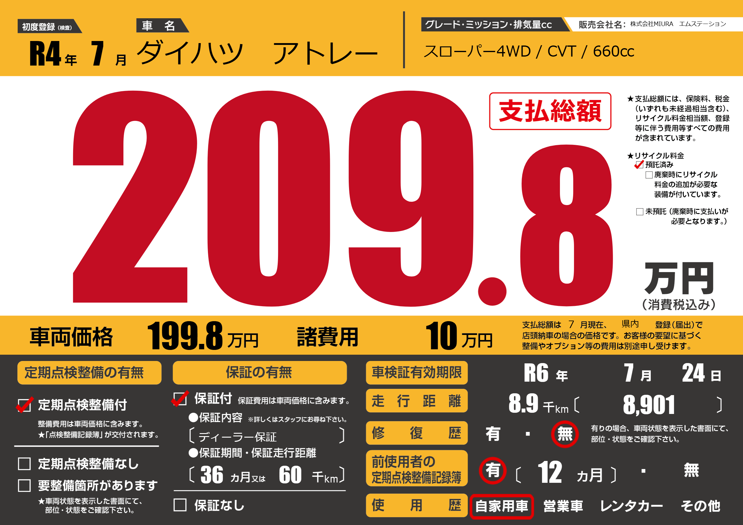 | 走行キロ | 0.8万km | 初年度登録 | R4年7月 |