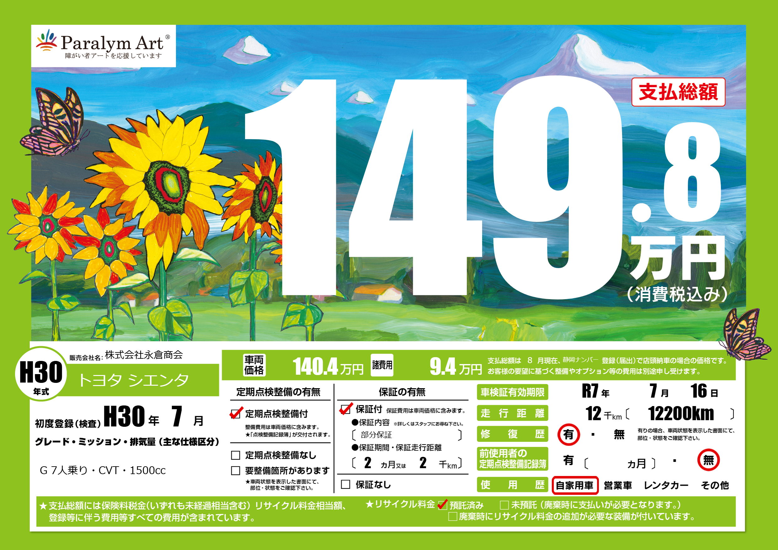 | 車名 | トヨタ シエンタ | グレード ミッション 排気量 |